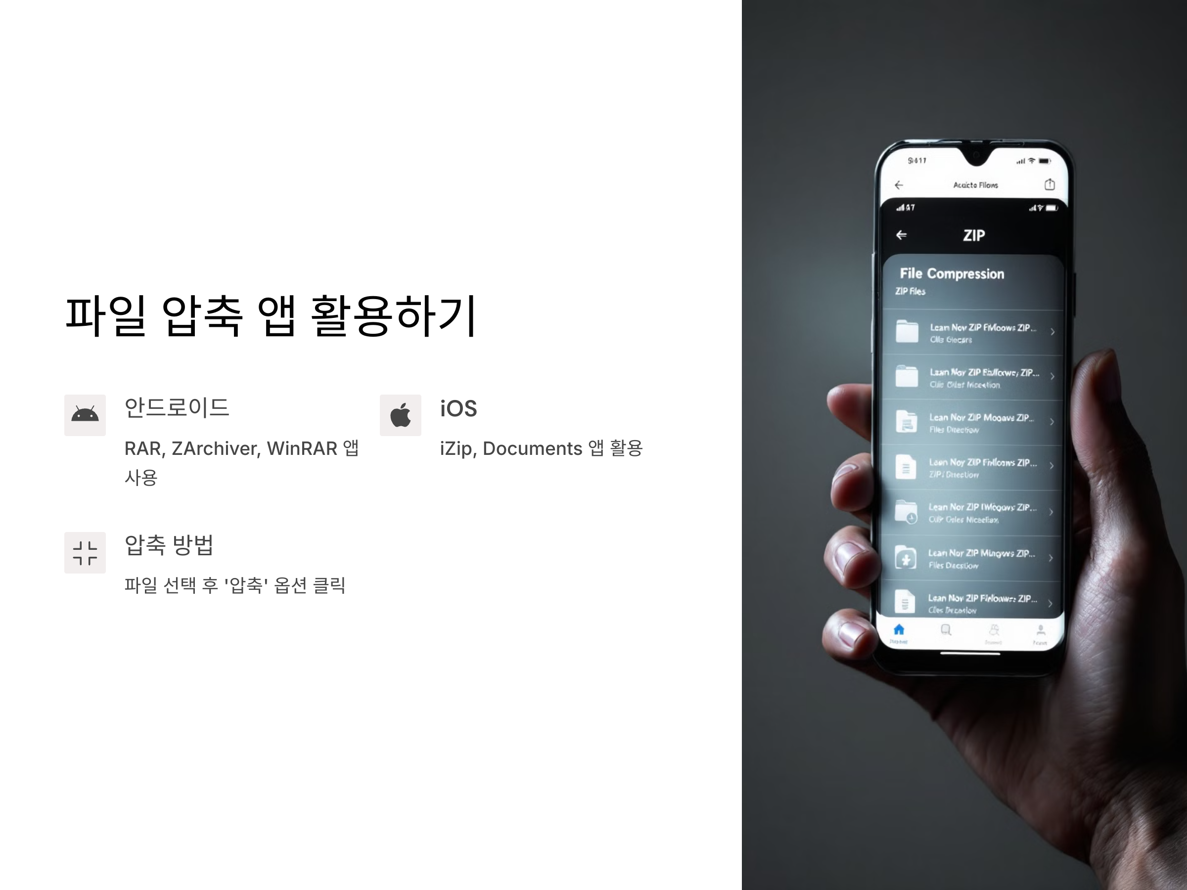 스마트폰을 사용하면서 파일을 압축하고 전송하는 것이 중요한 상황이 많습니다. 특히, 여러 개의 파일을 한 번에 보내거나 큰 용량의 파일을 전송할 때 압축을 통해 용량을 줄이는 것이 매우 유용합니다. 스마트폰에서 손쉽게 파일을 압축하고 전송하는 방법을 살펴보겠습니다. 이 글에서는 안드로이드와 iOS에서 파일을 압축하고, 이를 다른 사람에게 전송하는 방법에 대해 구체적으로 안내할 것입니다.