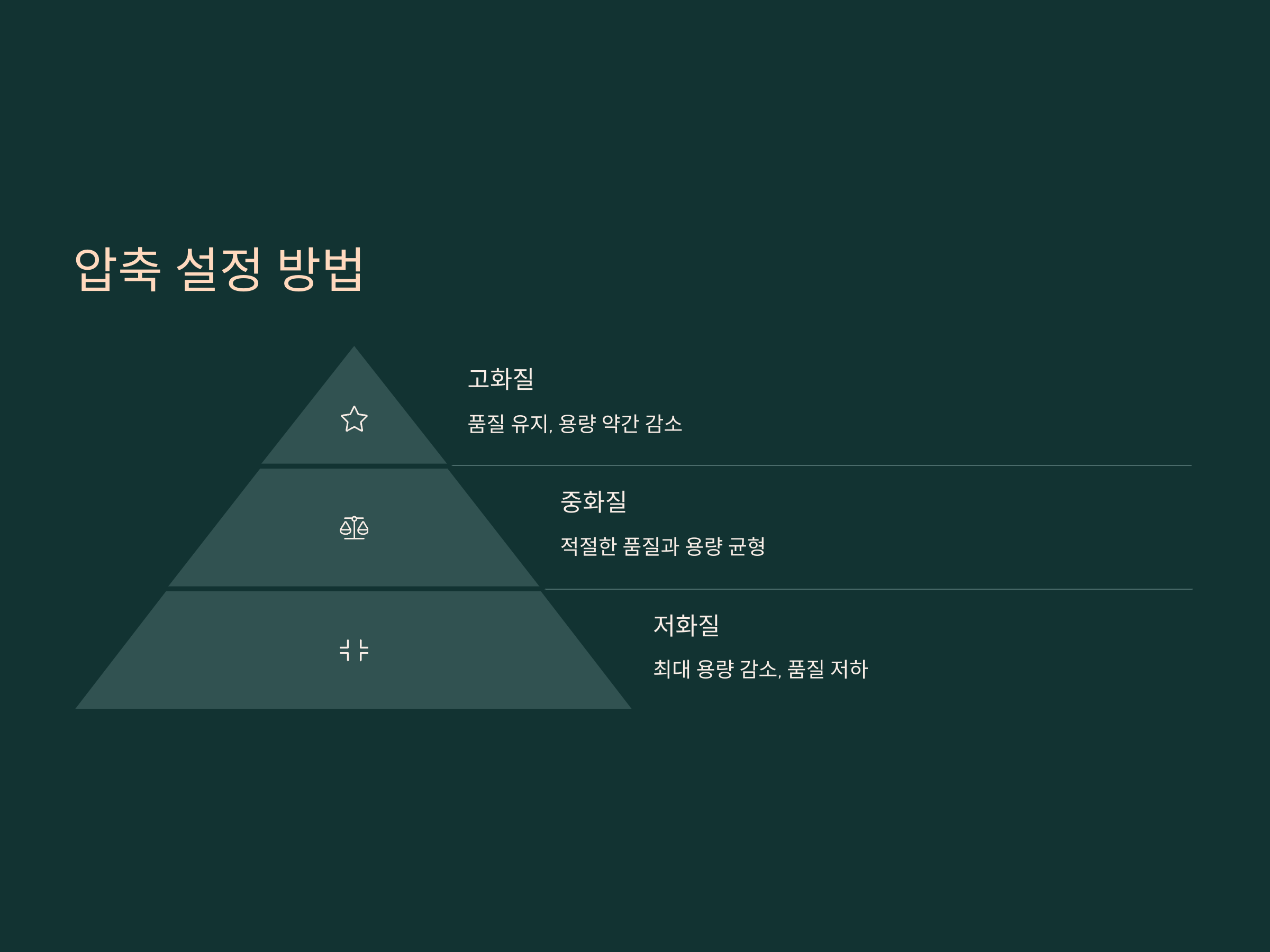 파일 크기를 크게 줄이고 싶다면 중화질 또는 저화질 옵션을 선택할 수 있습니다. 이런 옵션은 파일 크기는 많이 줄여주지만, 영상 품질이 다소 낮아질 수 있습니다. 특히, 긴 영상 파일이나 여러 개의 영상을 압축할 때 유용합니다.