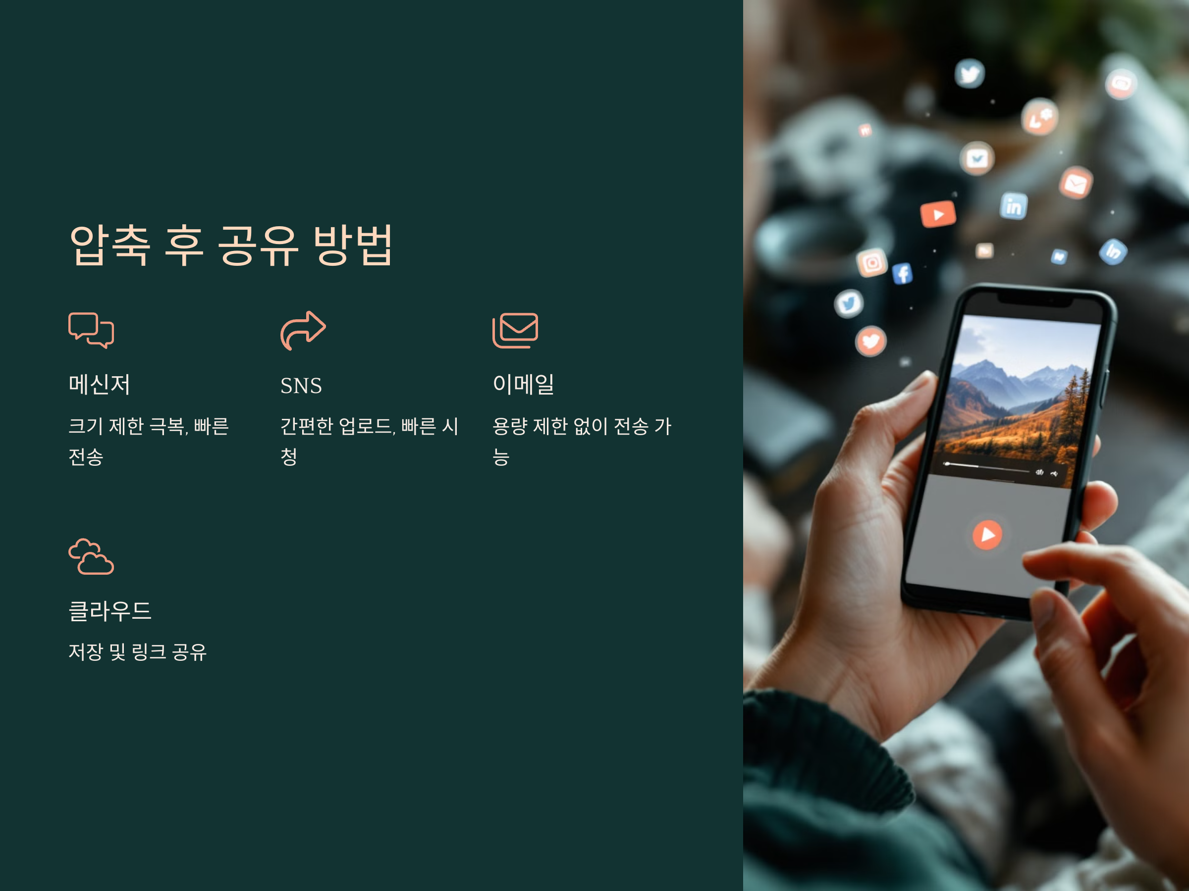 동영상을 압축한 후에는 이제 쉽게 공유할 수 있습니다. 압축된 파일은 용량이 작아져서, 메신저나 SNS를 통해 빠르게 전송할 수 있습니다. 또한, 이메일을 통해 전송하거나 클라우드 저장소에 업로드하여 다른 사람과 쉽게 공유할 수 있습니다.