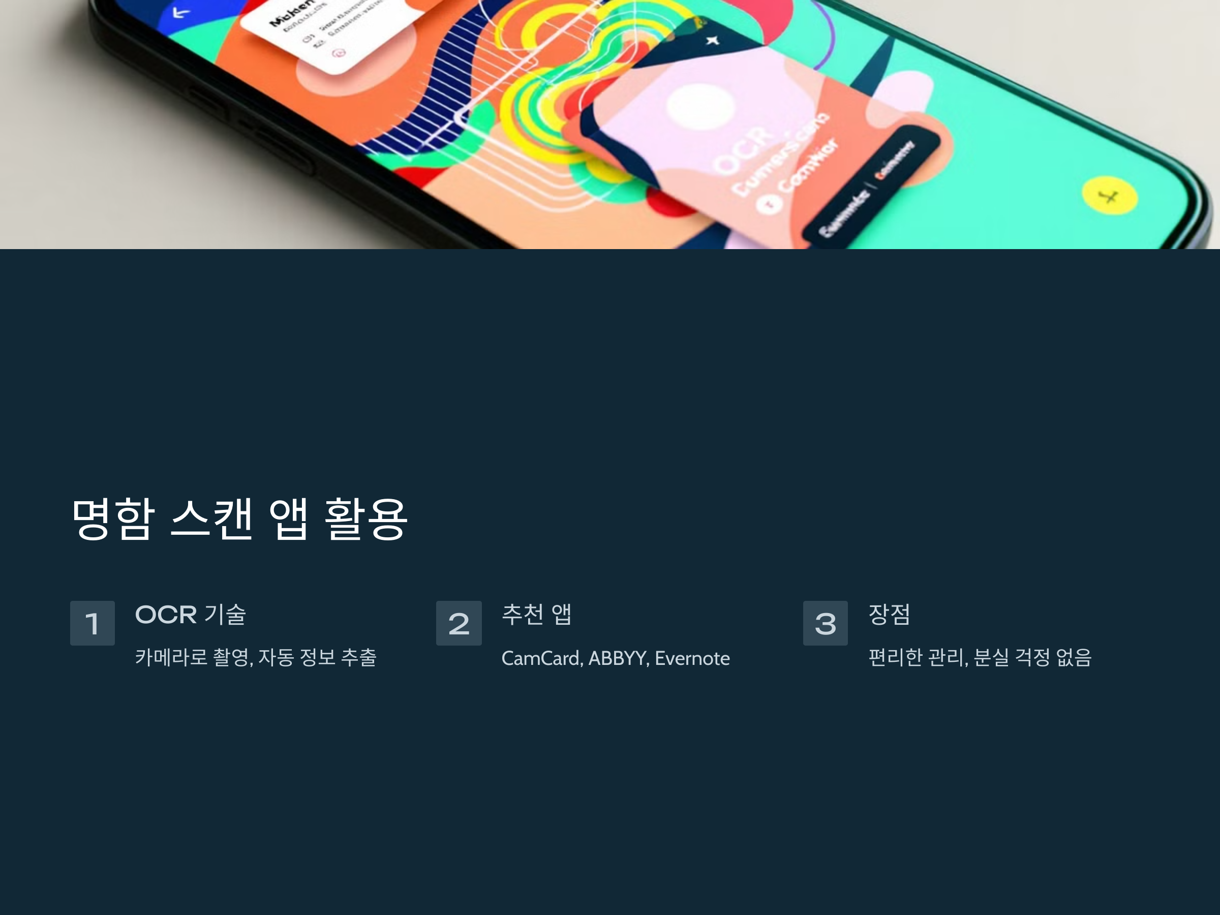 최근 명함 스캔 앱은 OCR(광학 문자 인식) 기술을 이용하여 종이 명함을 스마트폰으로 쉽게 저장할 수 있도록 돕습니다. 앱을 실행한 후 명함을 카메라로 촬영하면 자동으로 정보를 추출하여 연락처에 저장됩니다.