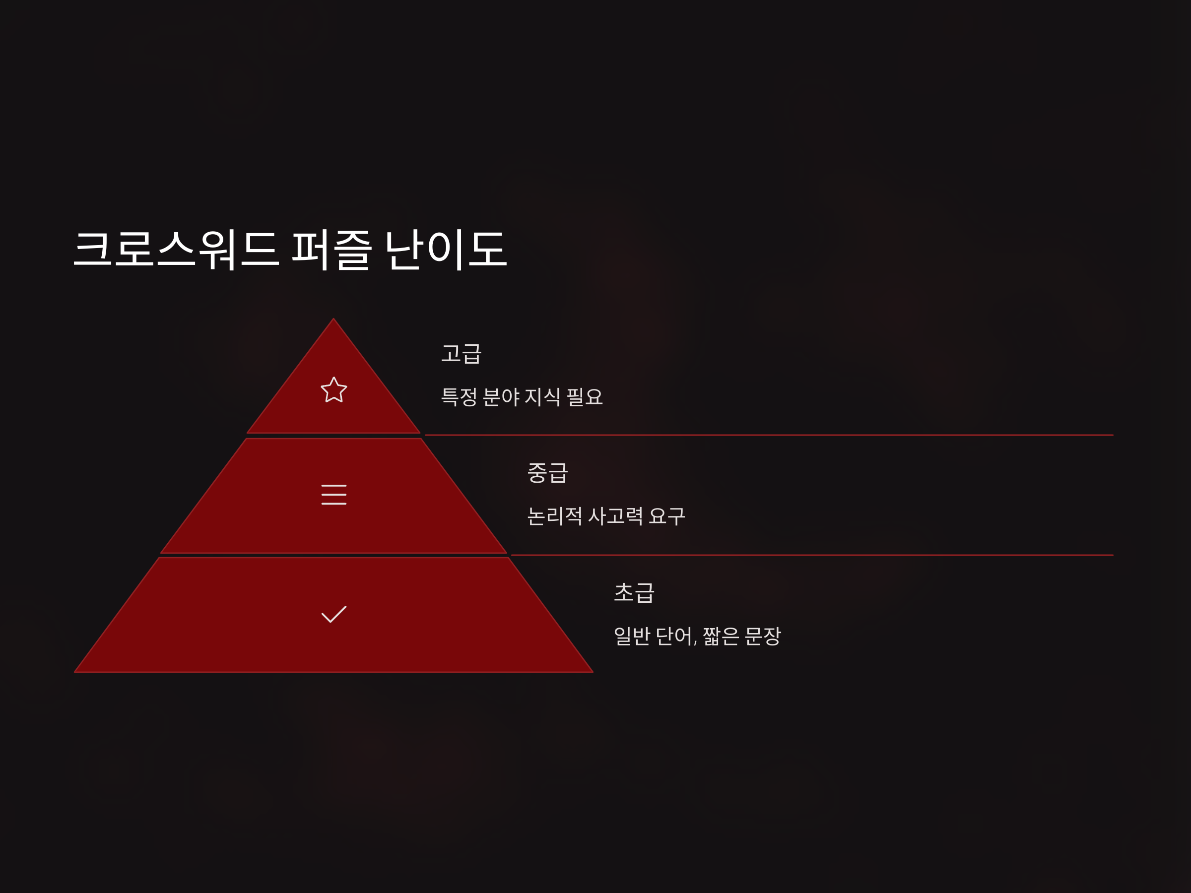 중급 난이도는 조금 더 긴 문장과 다소 어려운 단어들이 등장합니다. 퍼즐을 풀기 위해서는 약간의 배경 지식이나 논리적인 사고가 필요합니다.