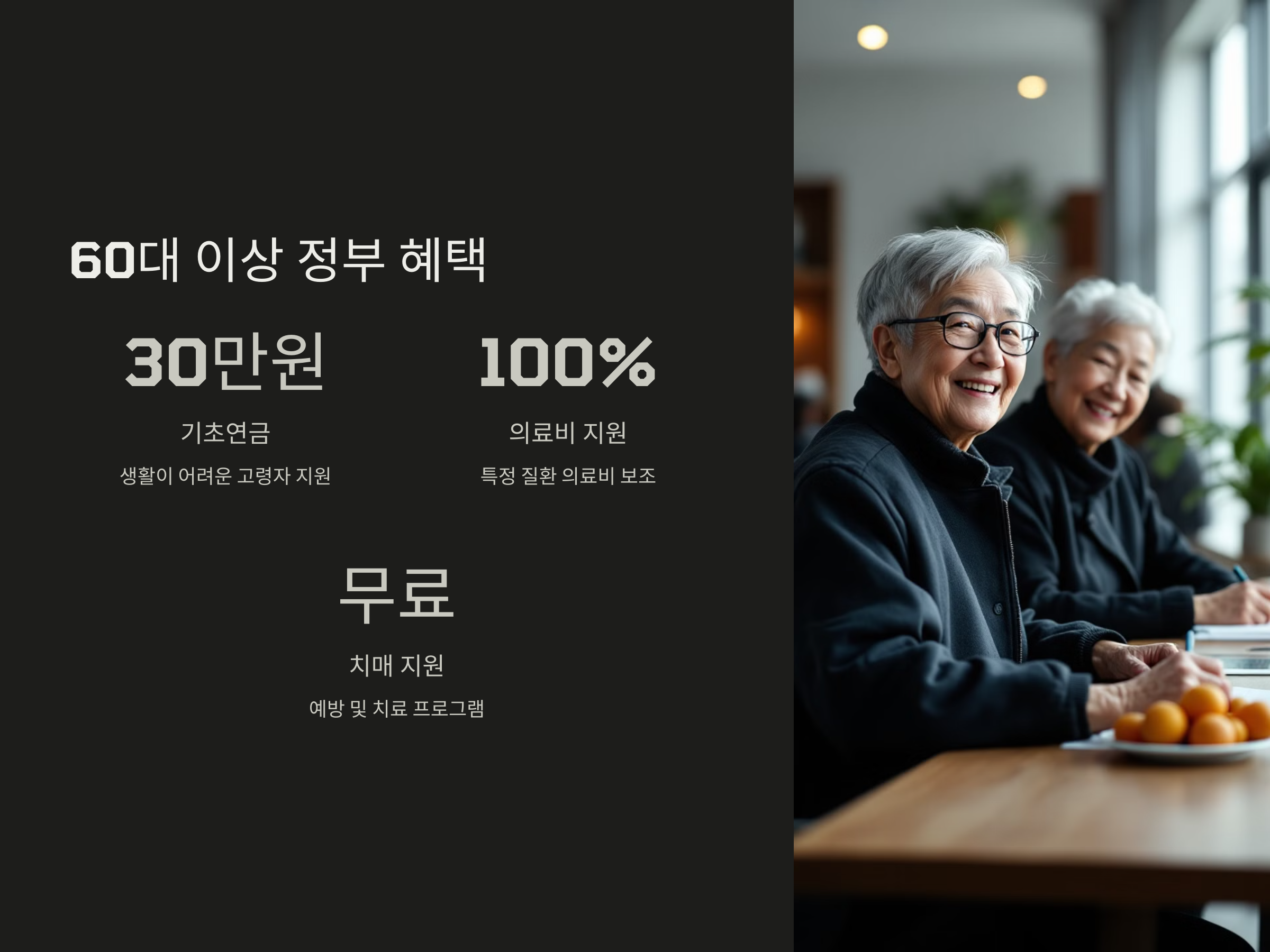 60대 이상은 본격적인 노후를 맞이하는 시기입니다. 이때 받을 수 있는 혜택은 주로 건강 관리와 노후 지원에 집중됩니다.