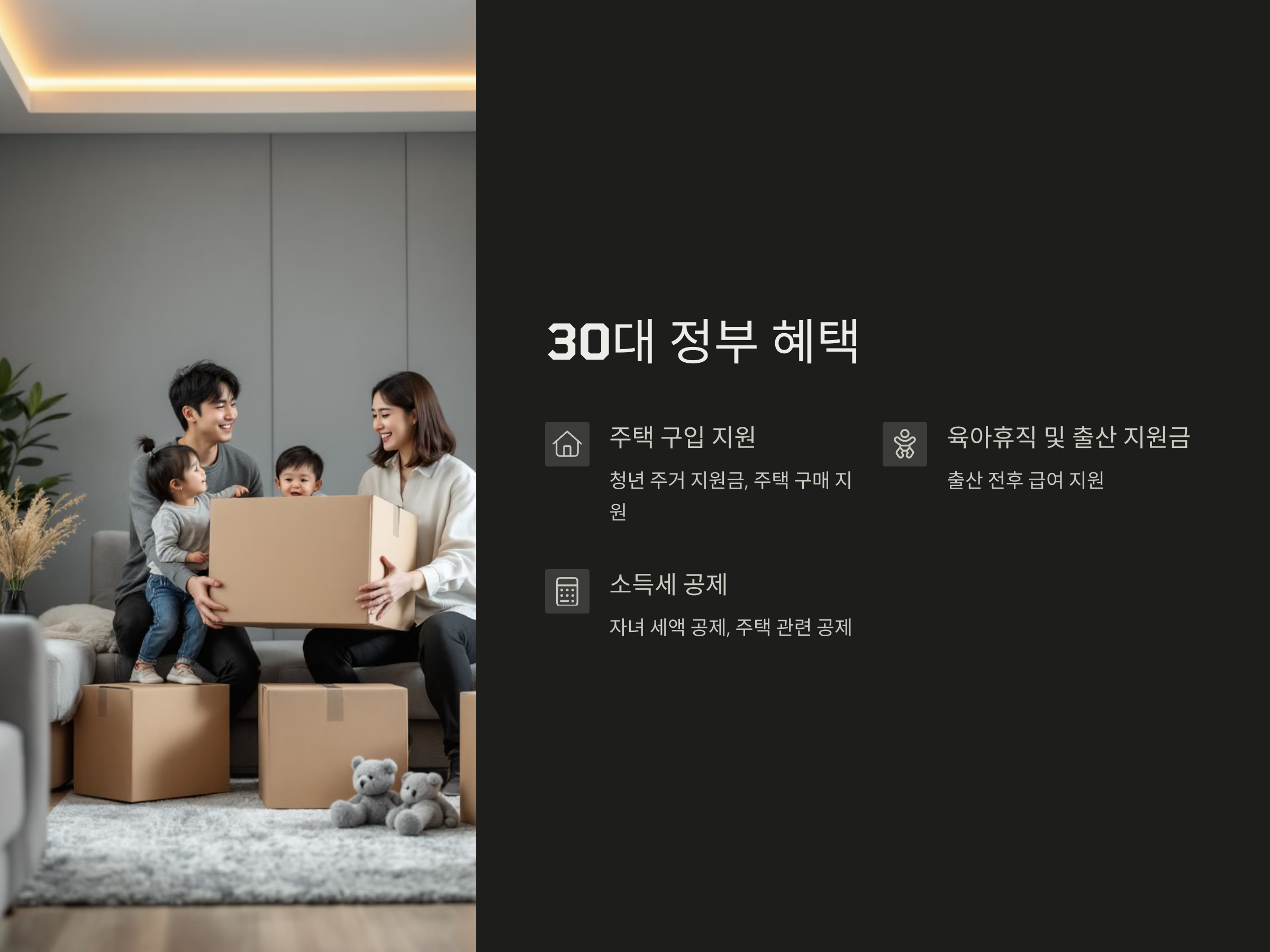 30대는 결혼, 자녀 양육, 주택 구입 등 여러 가지 중요한 결정을 내려야 하는 시기입니다. 이때 받을 수 있는 정부의 다양한 지원금과 혜택이 있습니다.