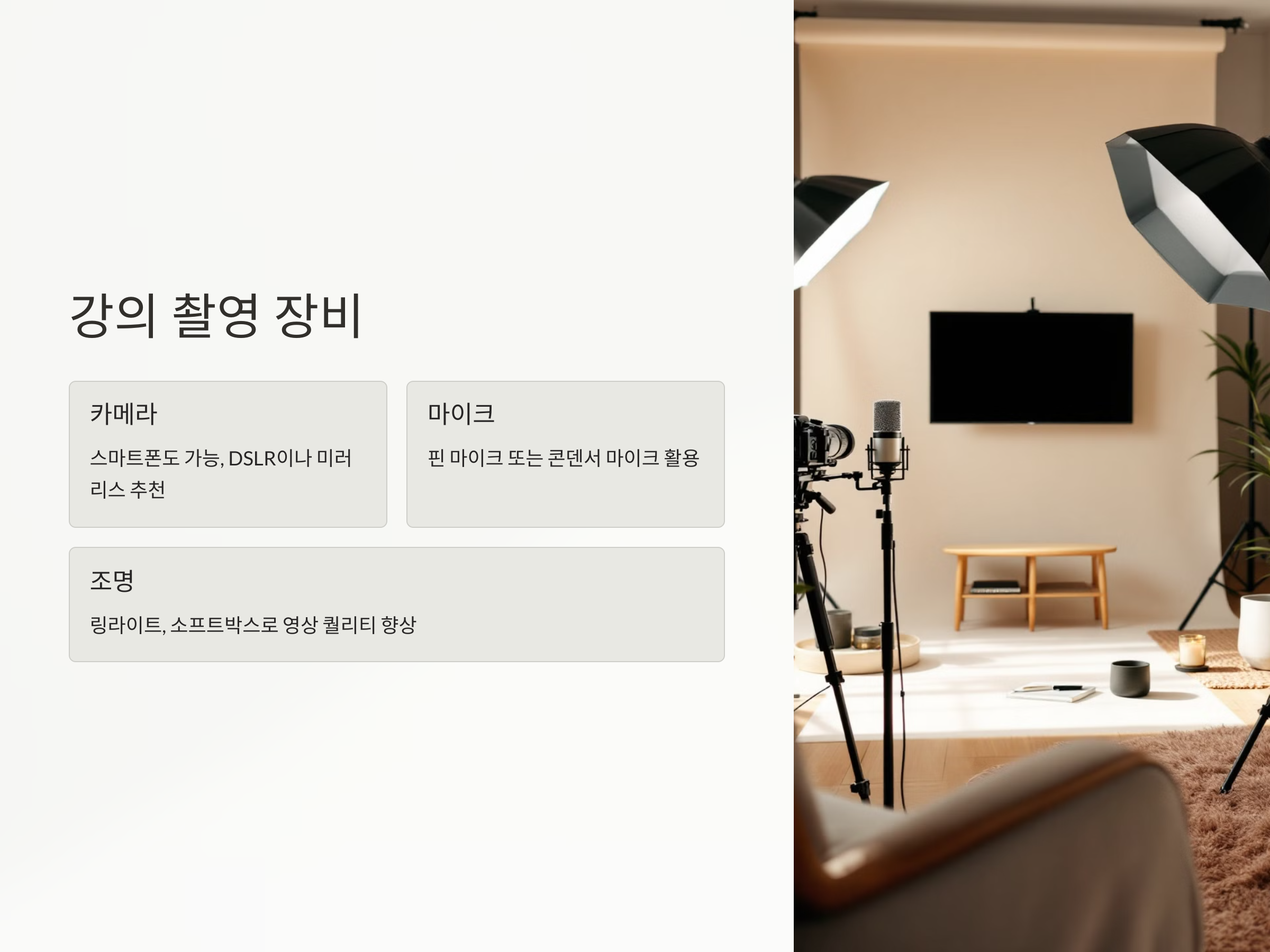 - 조명: 링라이트 또는 소프트박스 조명을 활용하면 영상 퀄리티 향상