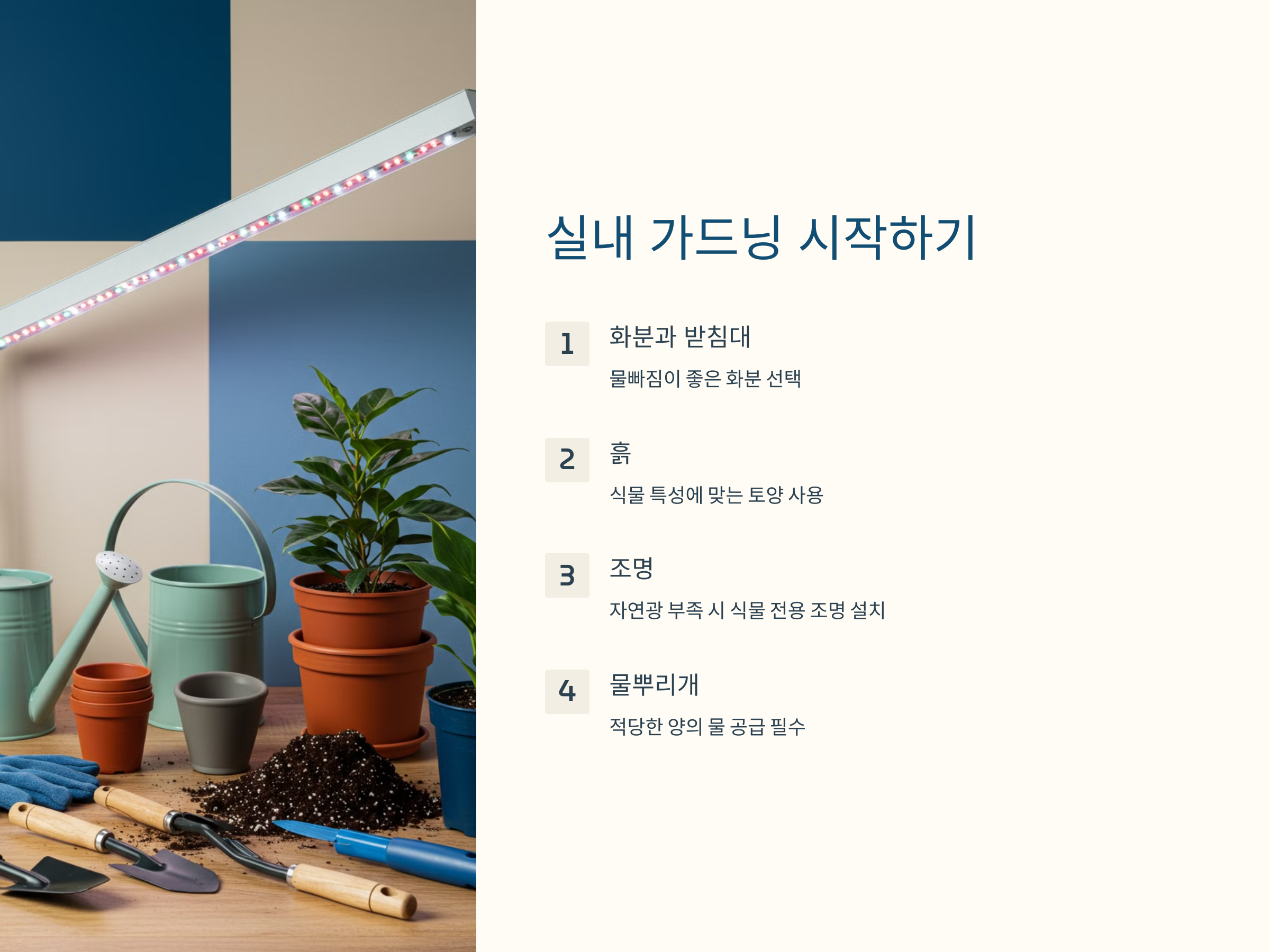 이러한 도구들이 준비되면, 이제 실내 가드닝을 시작할 수 있는 환경이 만들어집니다. 식물의 종류에 따라 온도와 습도를 조절할 수 있는지, 그리고 자연광이 충분한지 등을 점검한 후 식물을 선택하는 것이 중요합니다.