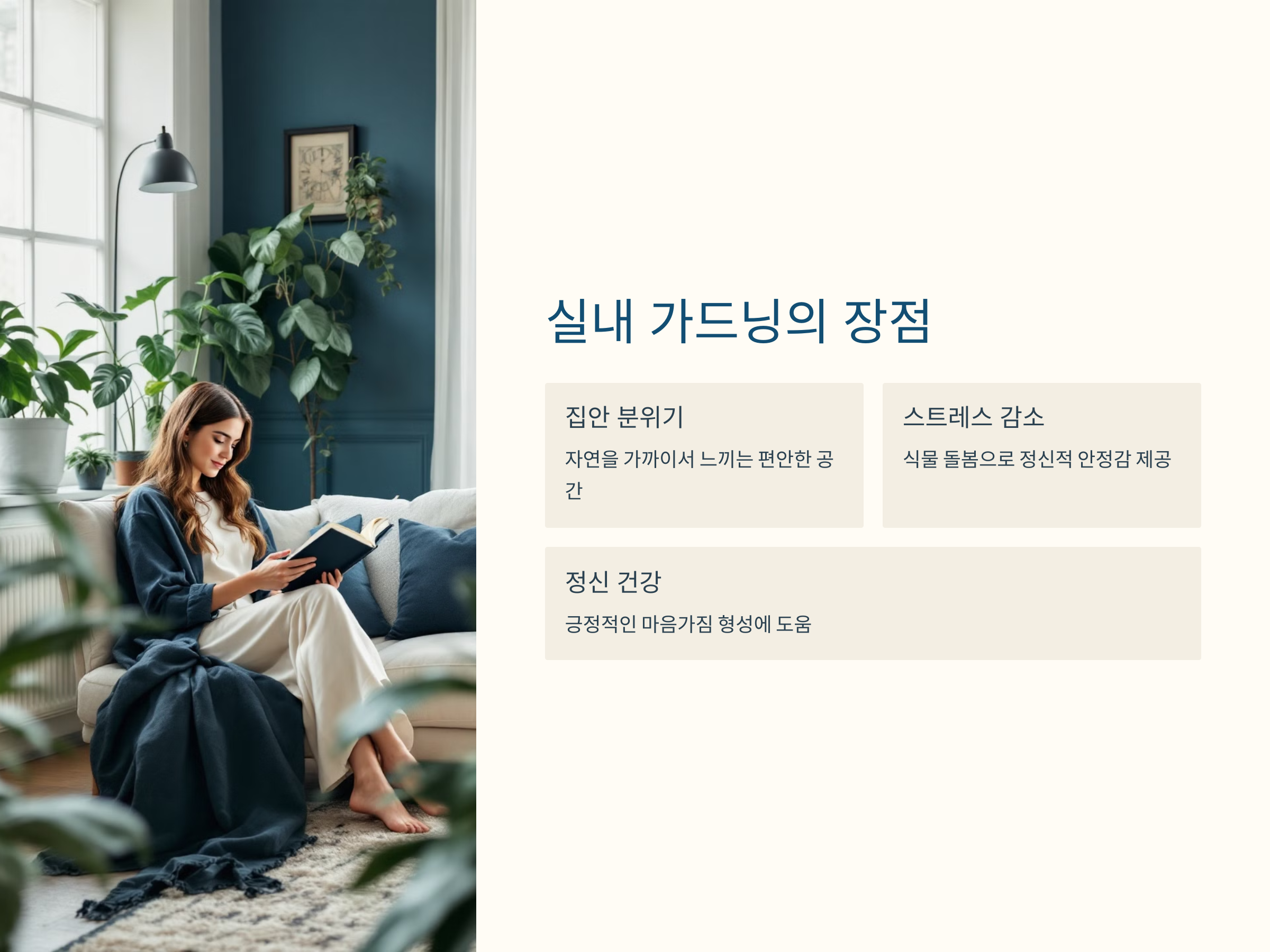 실내 가드닝은 집안의 분위기를 바꿔주는 중요한 역할을 합니다. 식물이 있는 공간은 자연을 가까이서 느낄 수 있어 사람들에게 편안한 느낌을 줍니다. 또한, 실내 가드닝을 통해 스트레스 수준을 낮출 수 있는 효과도 있습니다.