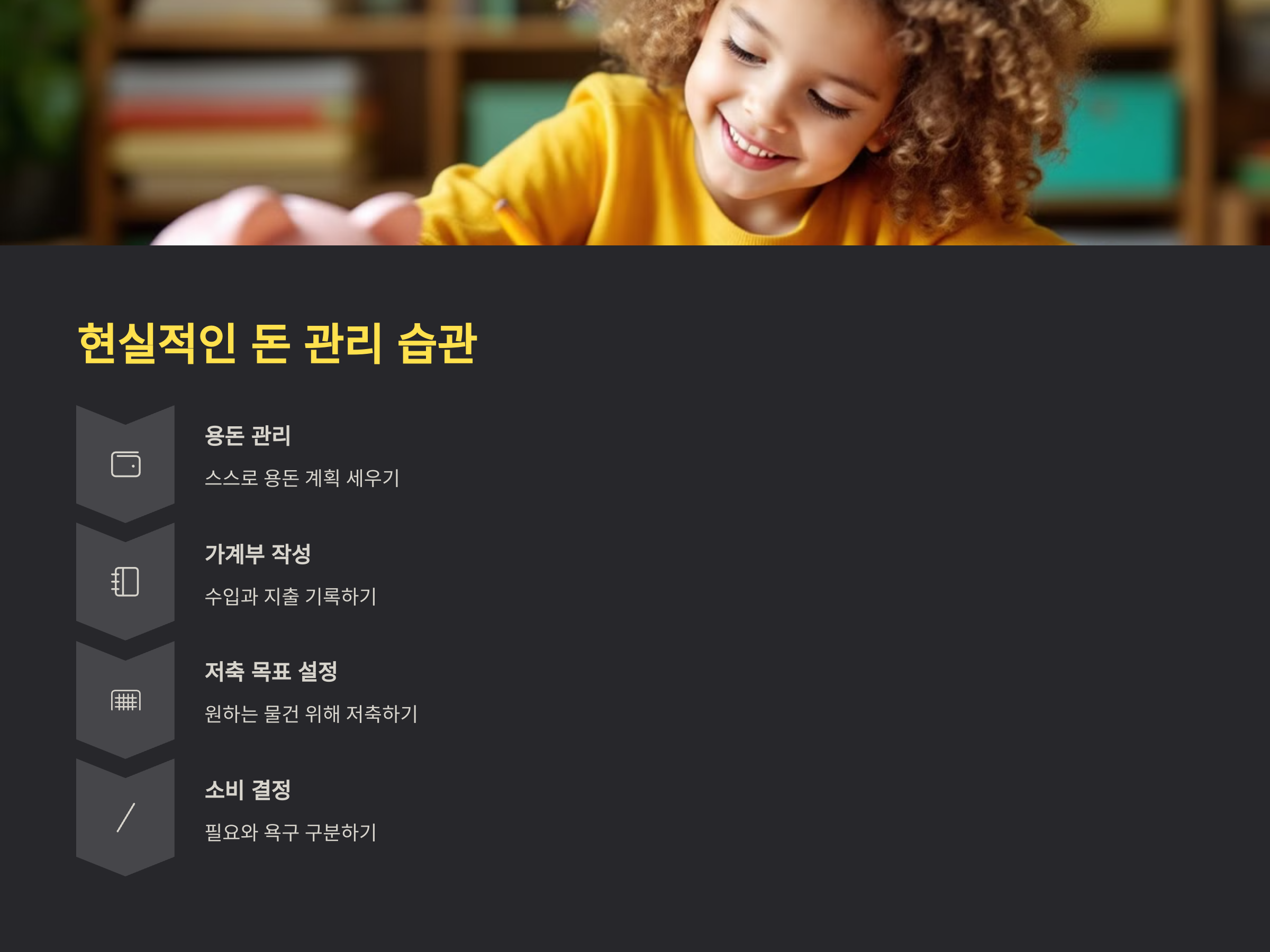 아이들에게 용돈을 주고, 어떻게 관리할지 스스로 계획을 세워보게 하는 방법은 아주 효과적입니다. 용돈을 어떻게 쓸지, 얼마를 저축할지, 어떻게 소비할지를 결정하게 하는 활동을 통해 돈을 어떻게 계획적으로 사용하는지 배울 수 있습니다.