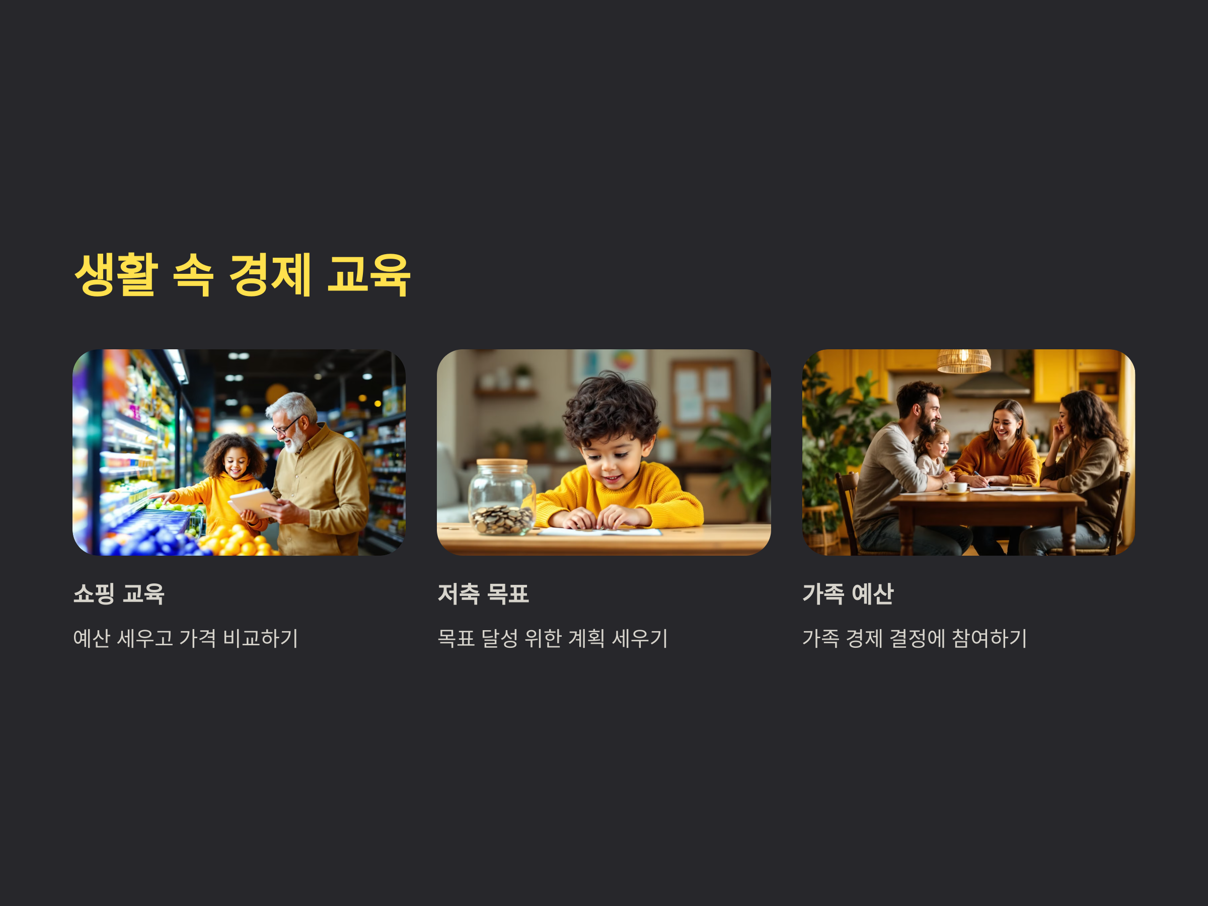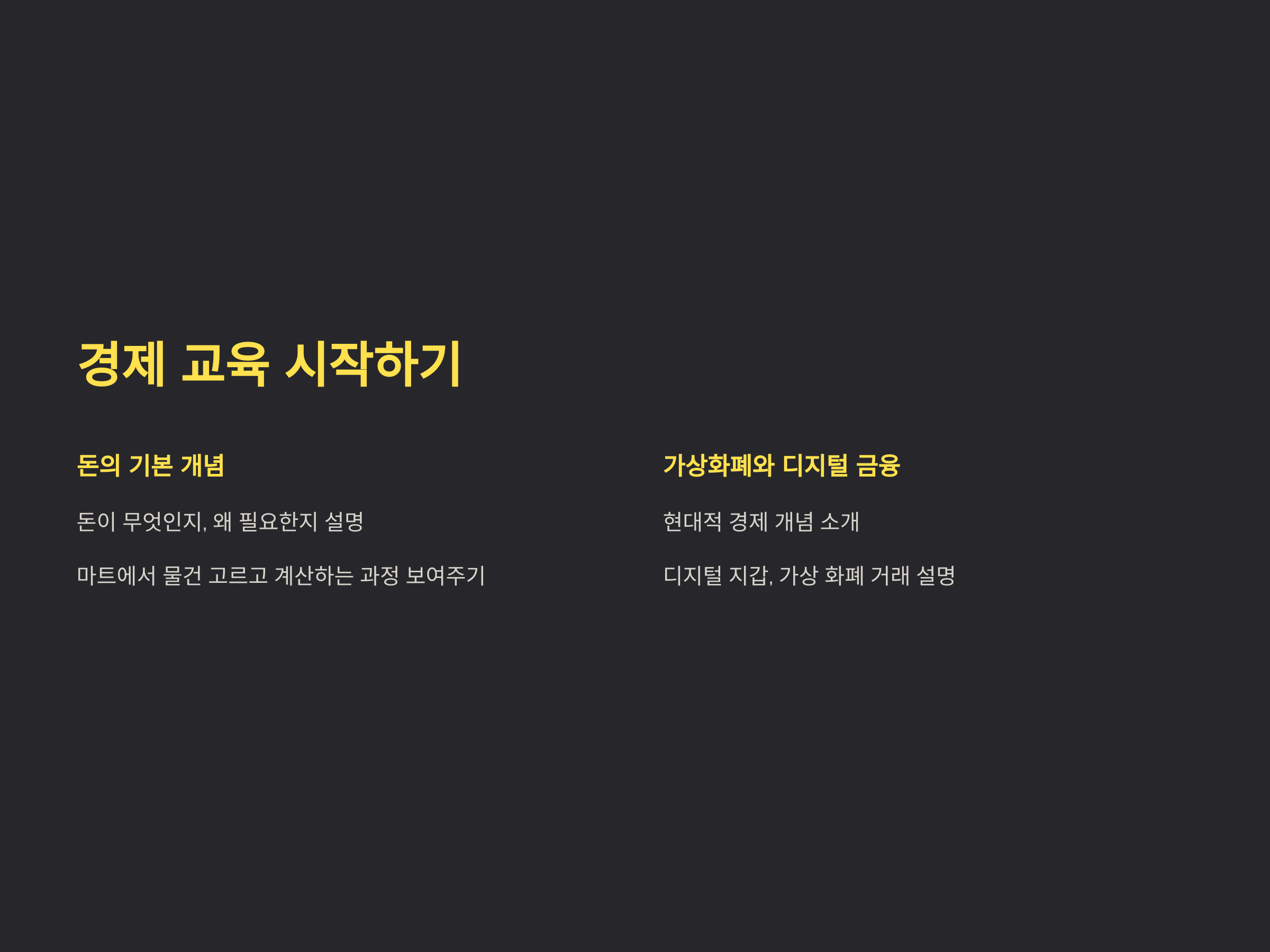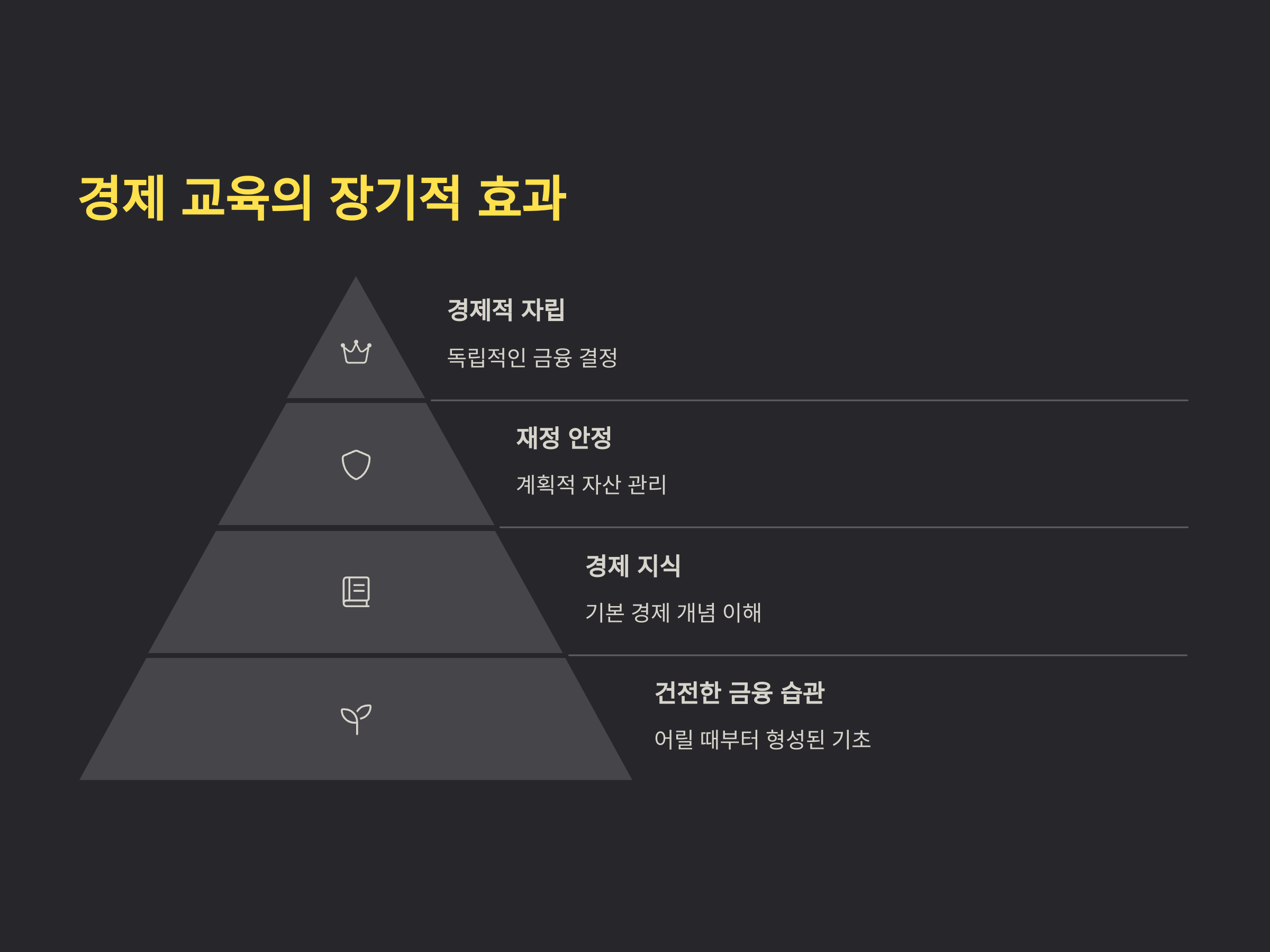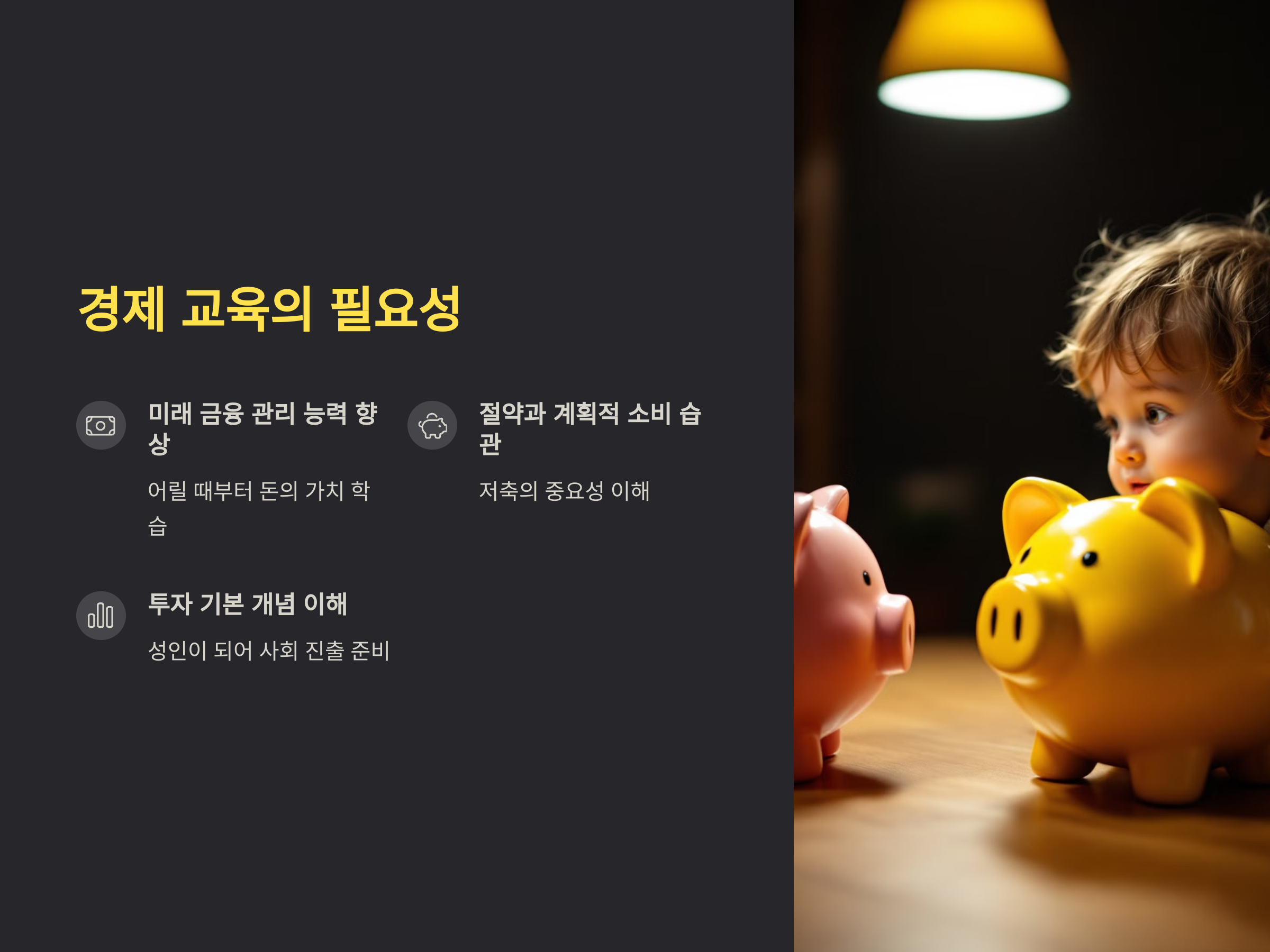 경제 교육은 돈을 어떻게 버는지, 어떻게 사용하는지, 저축의 중요성, 그리고 투자와 같은 개념을 포함합니다. 이러한 기초적인 경제 개념을 아이들이 이해하게 되면, 성인이 되어 사회에 나갈 준비가 더 잘 되어 있을 것입니다.