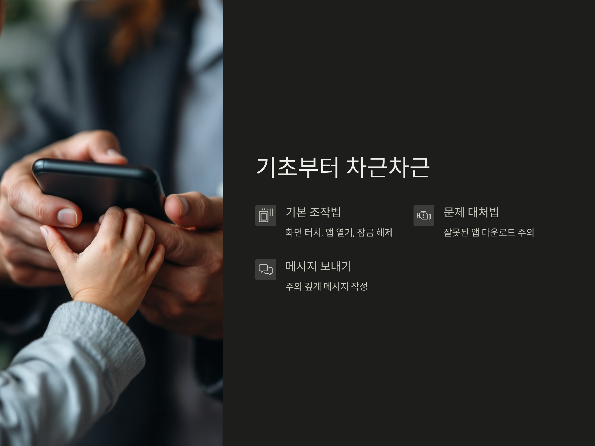 또한, 스마트폰을 사용하며 나타날 수 있는 다양한 문제들에 대해서도 가르쳐야 합니다. 예를 들어, 잘못된 앱을 다운로드하지 않도록 주의하는 방법이나, 잘못된 메시지를 보내지 않도록 주의 깊게 알려주는 것이 좋습니다. 스마트폰을 제대로 사용할 수 있는 기초적인 훈련이 이루어져야만, 이후 더 고급스러운 기능을 배우는 데 어려움이 없을 것입니다.