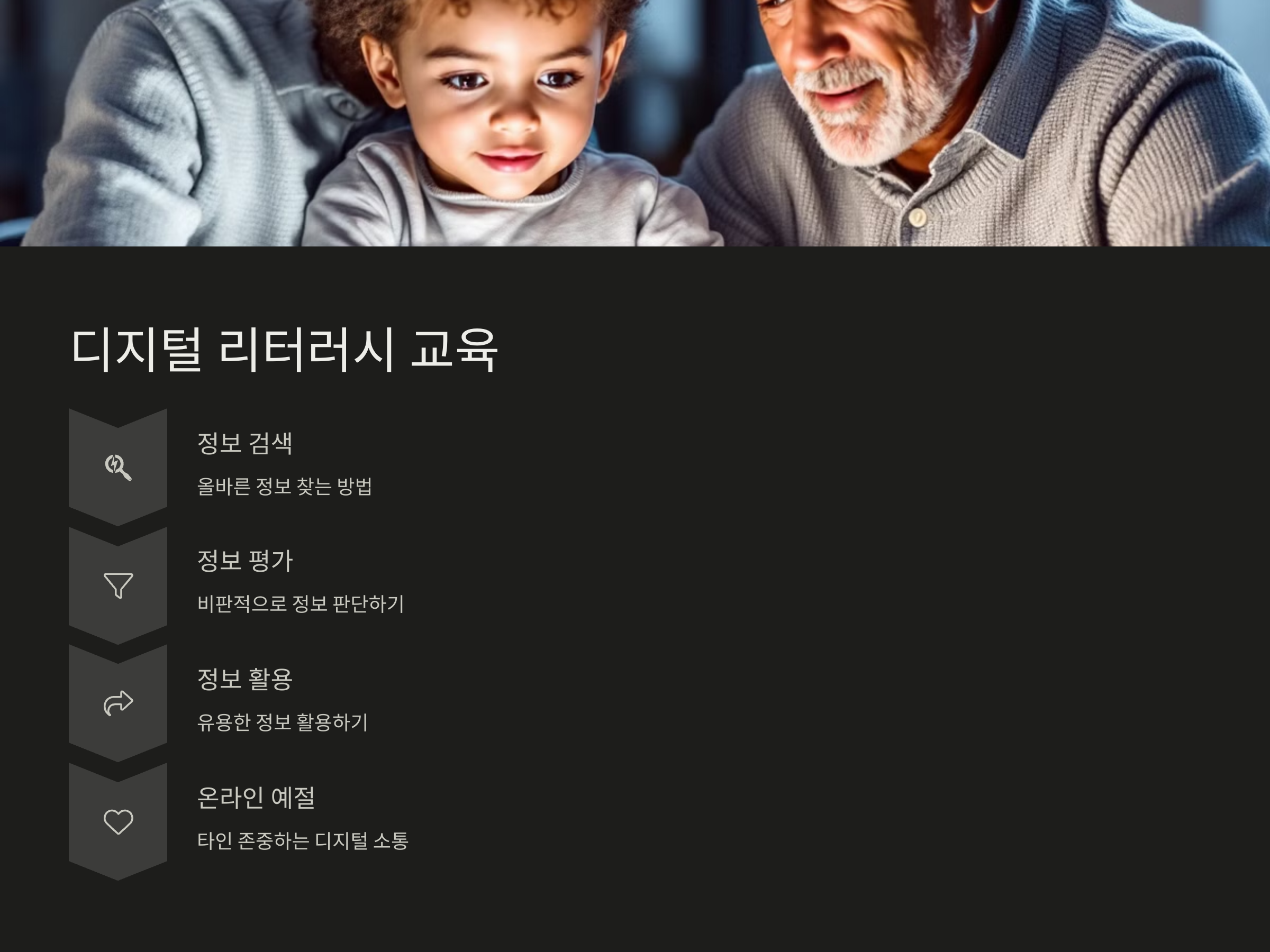 손자녀가 스마트폰을 사용할 때 중요한 것 중 하나는 바로 디지털 리터러시입니다. 디지털 리터러시란 디지털 환경에서 정보를 올바르게 찾고, 해석하고, 활용하는 능력을 말합니다. 스마트폰을 사용할 때 손자녀가 정보를 검색하거나, 소셜 미디어를 사용할 때 어떻게 정보를 비판적으로 평가할 수 있는지에 대해 교육해 주세요.