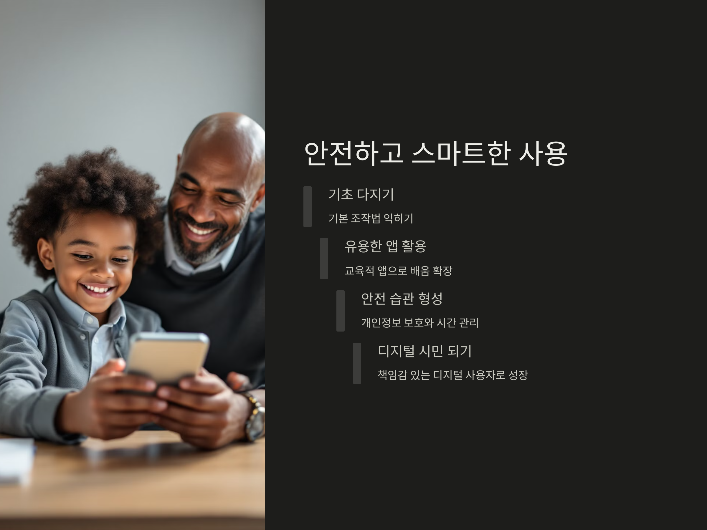 손자녀에게 스마트폰을 가르치는 것은 단순히 기술적인 부분을 넘어, 안전하게 그리고 책임감 있게 사용하는 방법을 배우는 중요한 과정입니다. 기본적인 사용법부터 시작하여, 앱 사용, 안전한 인터넷 사용법, 그리고 스마트폰 사용 시간 관리까지 차근차근 가르쳐 주세요. 디지털 리터러시와 온라인 예절도 함께 교육하면서, 손자녀가 스마트폰을 더 스마트하고 즐겁게 사용할 수 있도록 도와줄 것입니다.