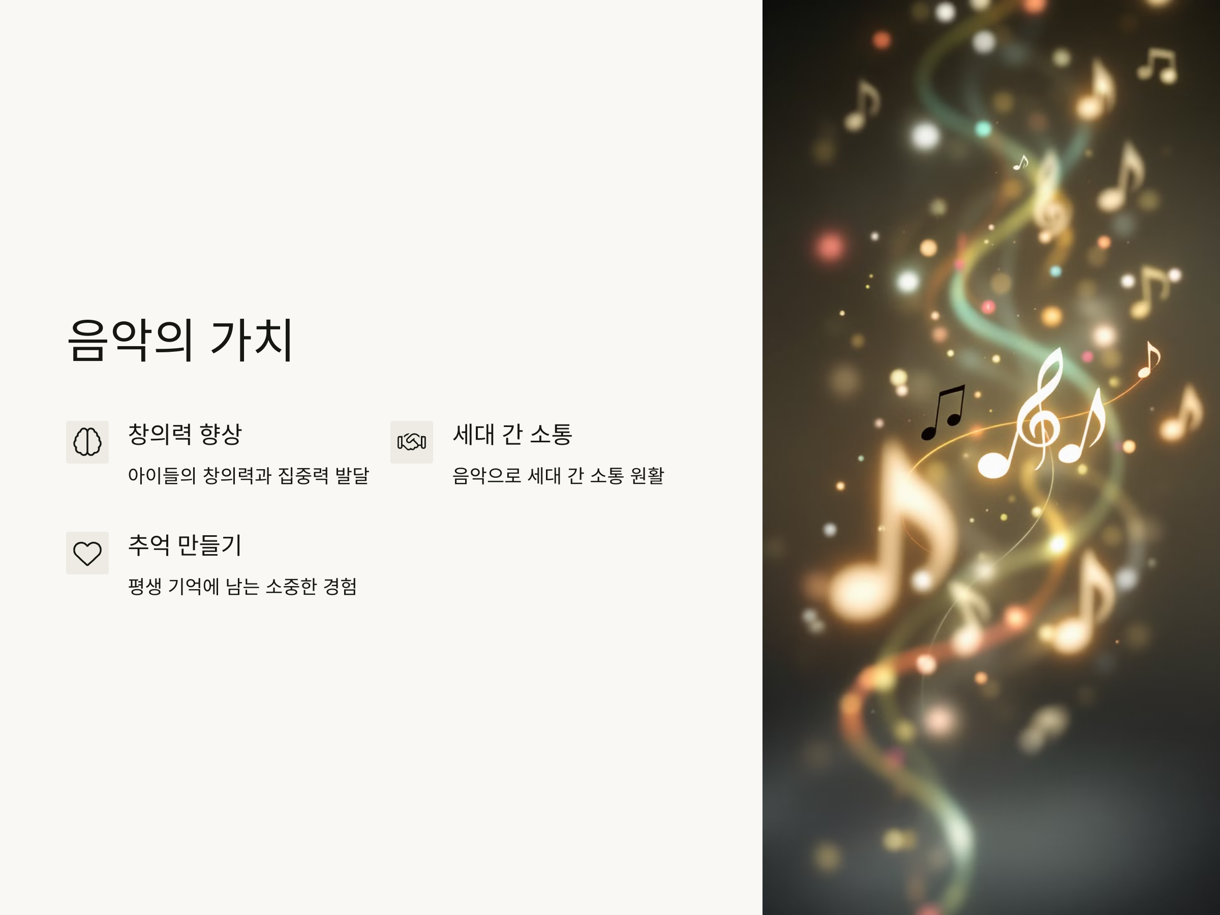 손자녀와 함께 악기를 배우는 것은 그 어떤 활동보다 소중한 경험이 될 수 있습니다. 음악을 배우는 과정에서 가족 간의 유대감은 더욱 강해지고, 서로의 감정을 나누는 기회가 됩니다. 또한, 손자녀에게는 인내심, 집중력, 창의력 등을 키울 수 있는 중요한 기회가 됩니다.