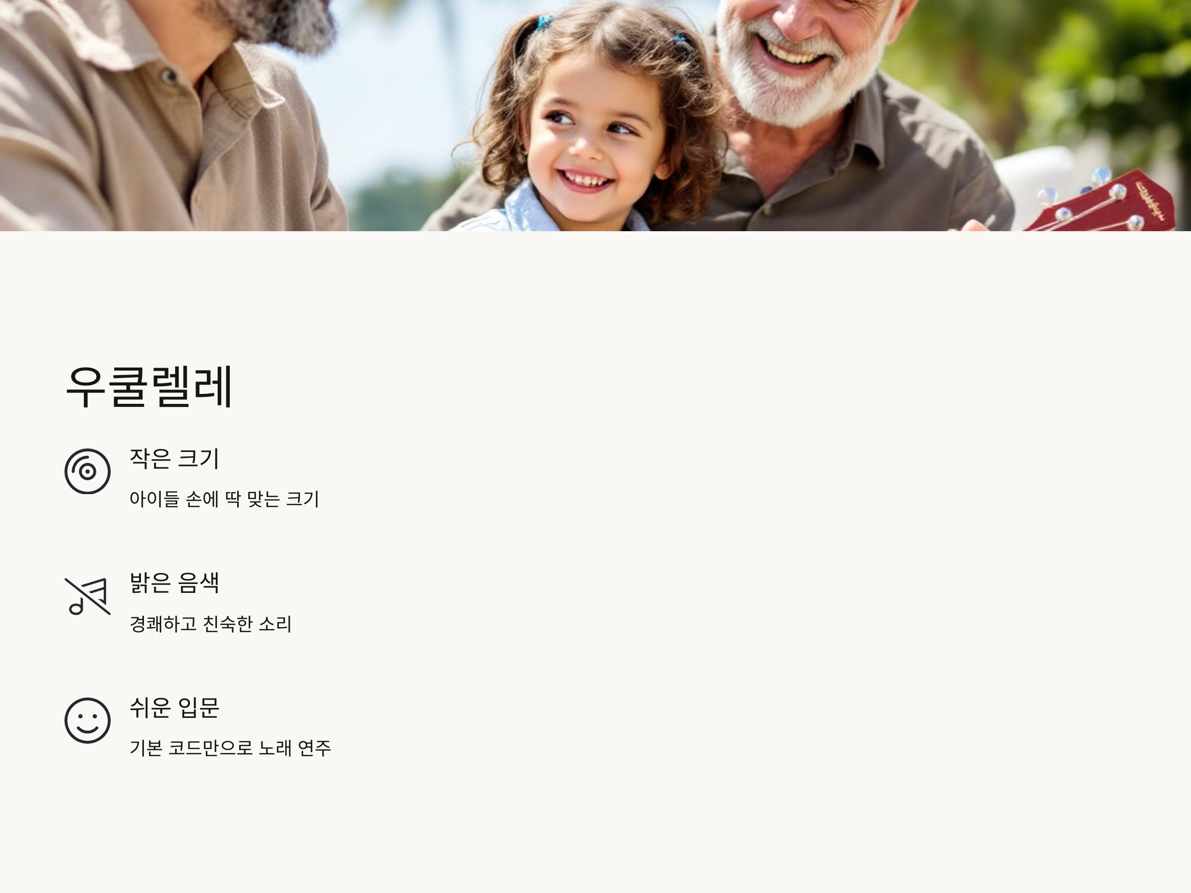 우쿨렐레는 작은 크기와 간편함 덕분에 손자녀와 함께 배우기 좋은 악기입니다. 기타와 비슷하지만, 훨씬 배우기 쉽고 부담 없이 시작할 수 있습니다. 또한, 우쿨렐레는 밝고 경쾌한 음색이 특징으로, 손자녀에게도 쉽게 친숙하게 다가갈 수 있는 악기입니다.