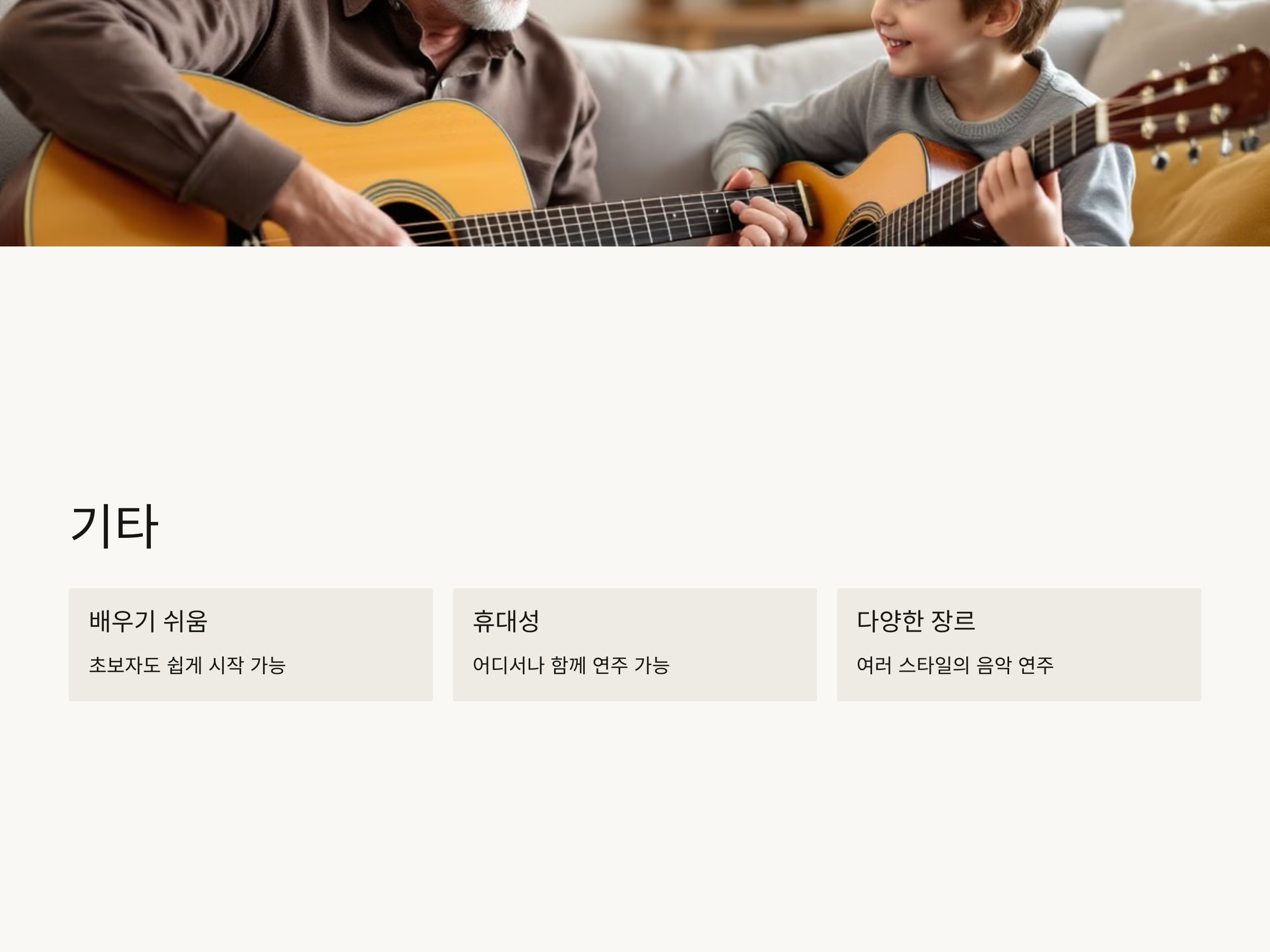 기타는 피아노와는 달리 휴대성이 뛰어나며, 다양한 스타일의 음악을 연주할 수 있어 가족 모두가 함께 연주하기에 좋은 악기입니다. 초보자도 쉽게 시작할 수 있는 악기이므로 손자녀와 함께 악보를 보며 노래를 부르거나, 함께 연주하는 즐거운 시간을 가질 수 있습니다.