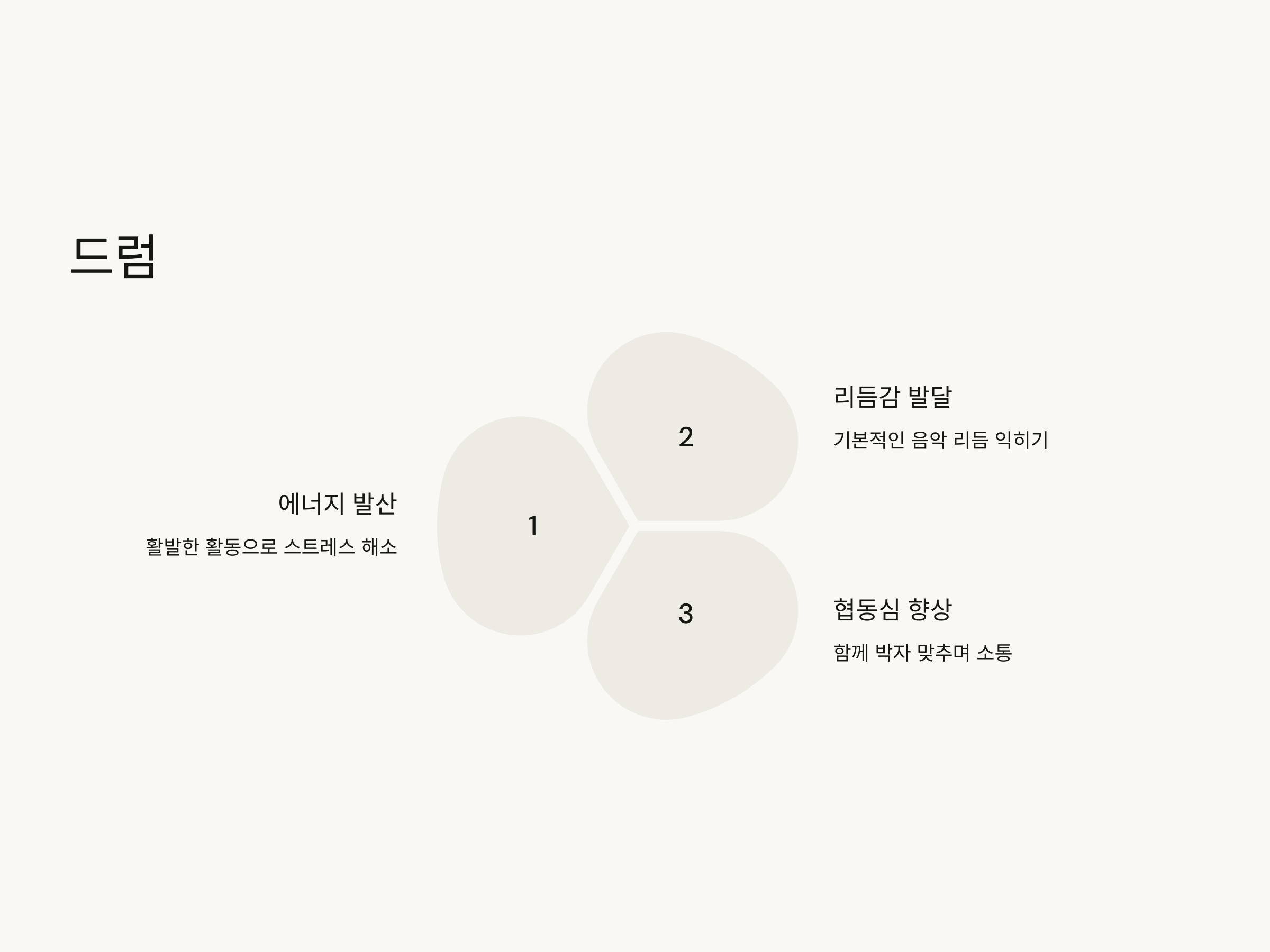 드럼은 또한 그룹 연주에 매우 적합한 악기입니다. 가족이 함께 드럼 세트를 놓고, 각자가 다른 드럼을 연주하면서 서로의 박자에 맞춰 연주하는 재미를 느낄 수 있습니다. 이 과정에서 가족 간의 협동심과 소통 능력을 키울 수 있습니다.