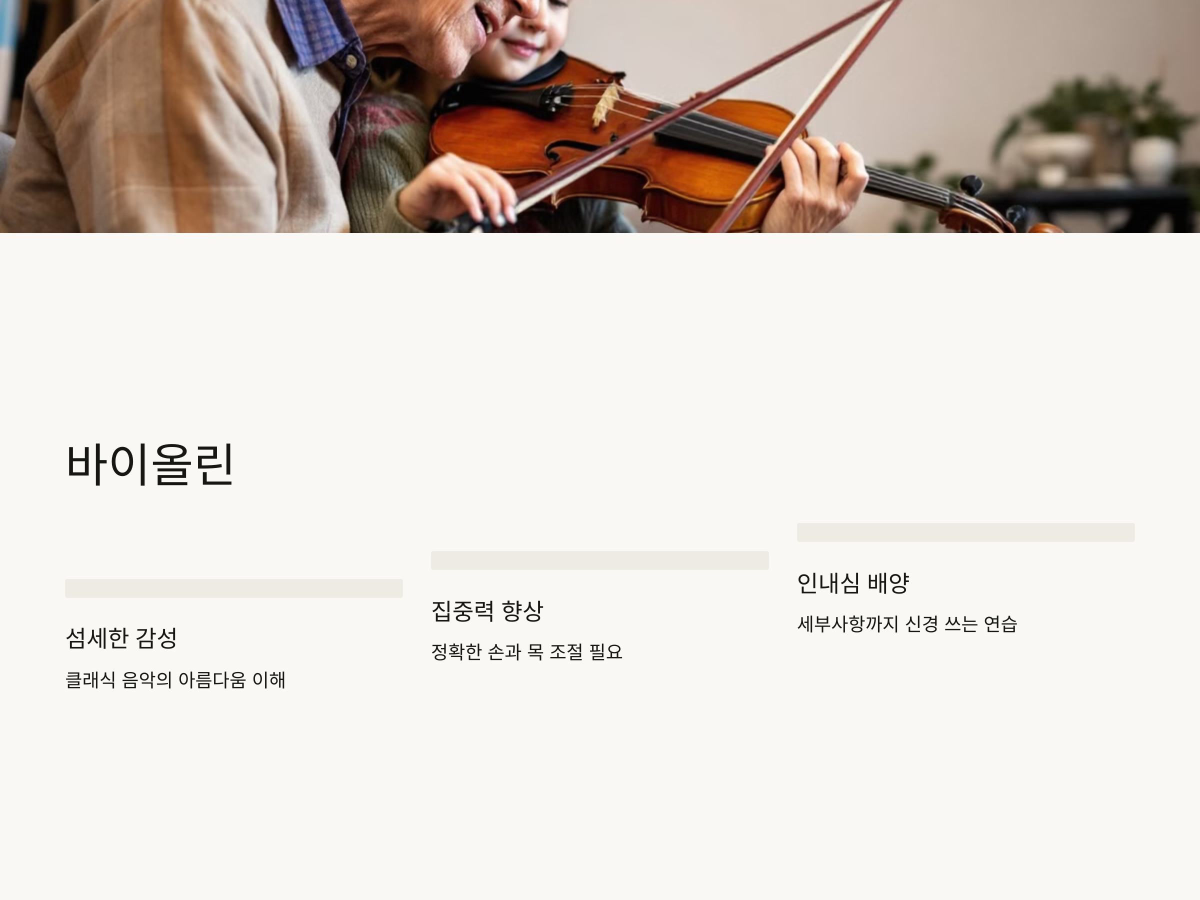 바이올린을 배우면 손자녀는 자연스럽게 음악의 아름다움과 감동을 느끼게 될 뿐만 아니라, 가족 간의 깊은 교감을 나누는 소중한 시간을 가질 수 있습니다.