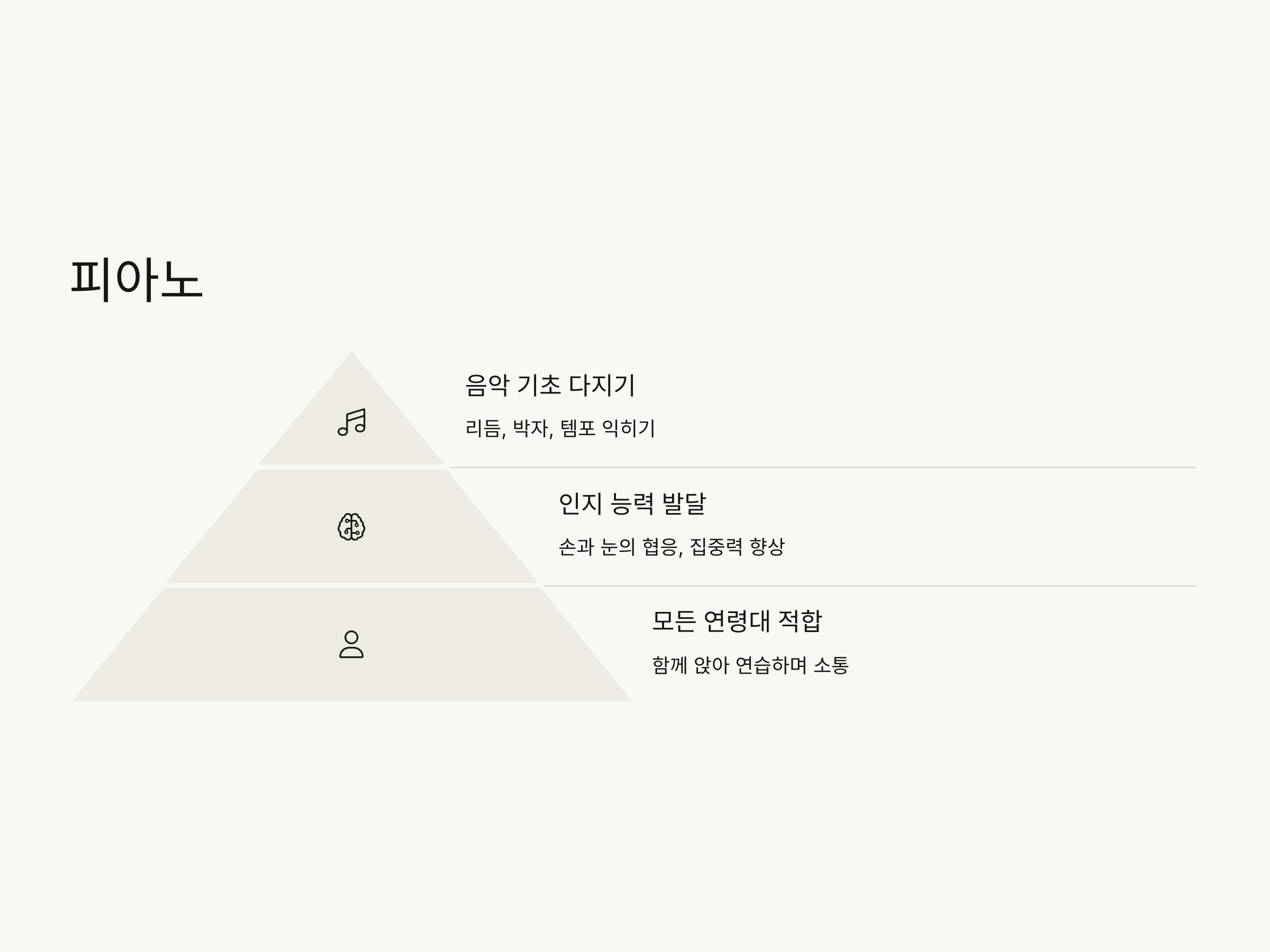 피아노는 모든 연령대가 쉽게 접근할 수 있는 악기입니다. 손자녀가 처음 음악을 배우기 시작할 때, 피아노는 그들이 음악에 대한 기초를 탄탄하게 다질 수 있는 훌륭한 악기입니다. 다양한 연령대의 사람들이 함께 배울 수 있는 점이 장점입니다. 또한 피아노는 손과 눈의 협응을 요구하며, 집중력과 기억력 발달에도 도움을 줍니다.
