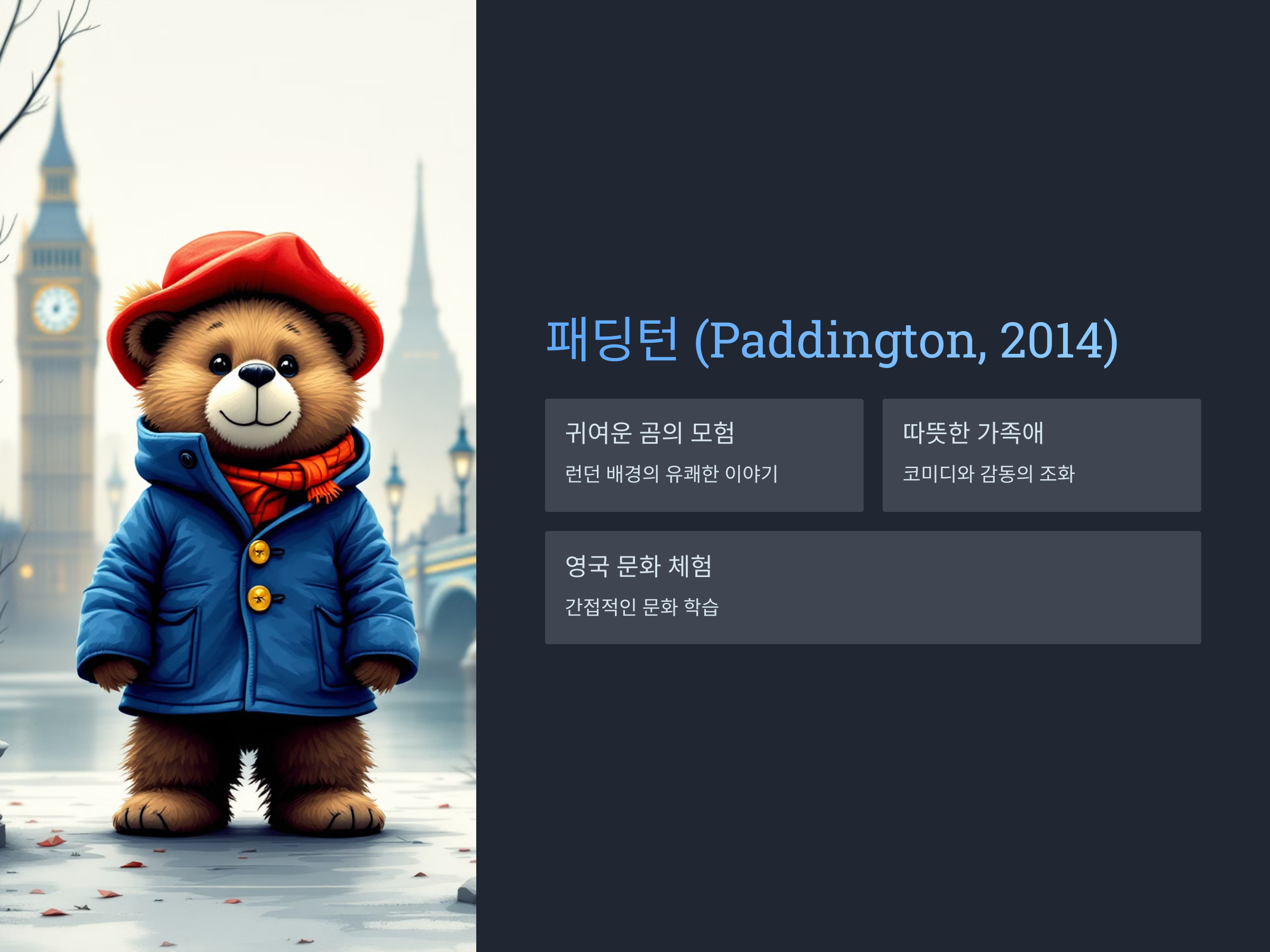 영국에서 온 귀여운 곰 패딩턴이 런던에서 벌이는 유쾌한 모험을 그린 영화입니다. 패딩턴의 엉뚱한 행동들이 웃음을 자아내지만, 그 속에는 따뜻한 가족애가 담겨 있습니다.
