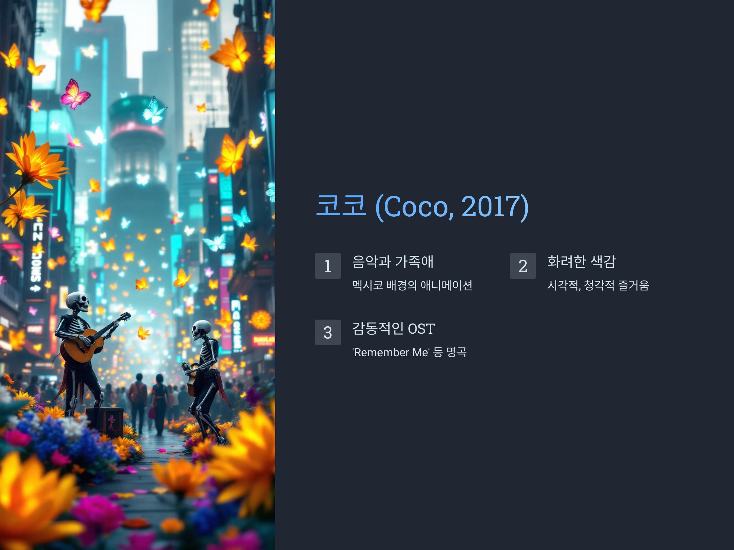 디즈니·픽사의 걸작 코코는 멕시코의 명절 죽은 자들의 날을 배경으로 한 영화입니다. 주인공 미겔이 우연히 죽은 자들의 세계로 가게 되면서 가족의 소중함을 깨닫는 이야기로, 음악과 화려한 색감이 어우러져 시각적, 청각적 즐거움을 선사합니다.