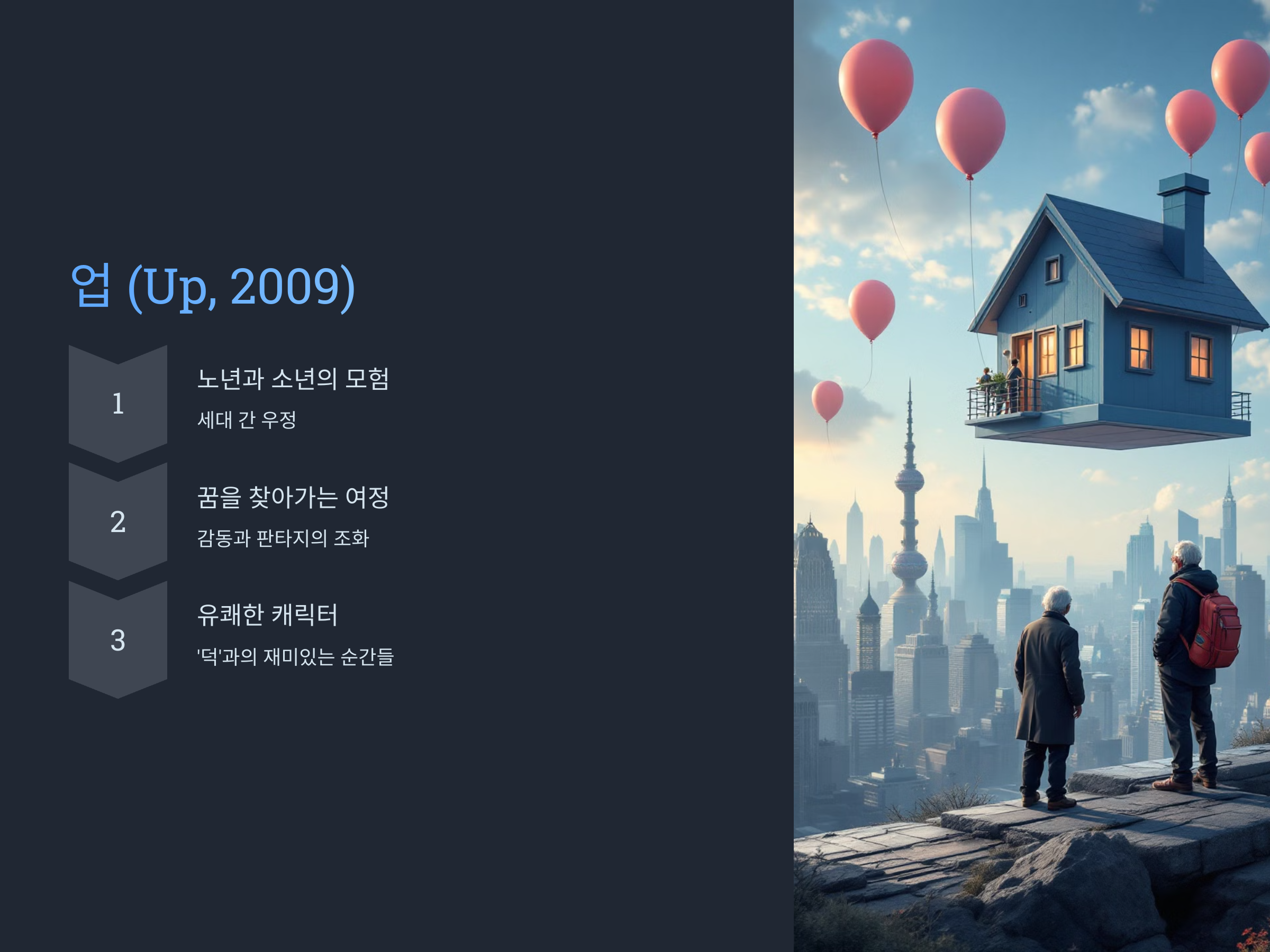 픽사의 대표적인 감동 애니메이션 중 하나로, 노년의 할아버지 '칼'과 어린 탐험가 '러셀'의 모험을 다룬 작품입니다. 잃어버린 꿈을 찾아가는 여정 속에서 세대 간의 우정과 가족애가 깊이 있게 그려집니다.