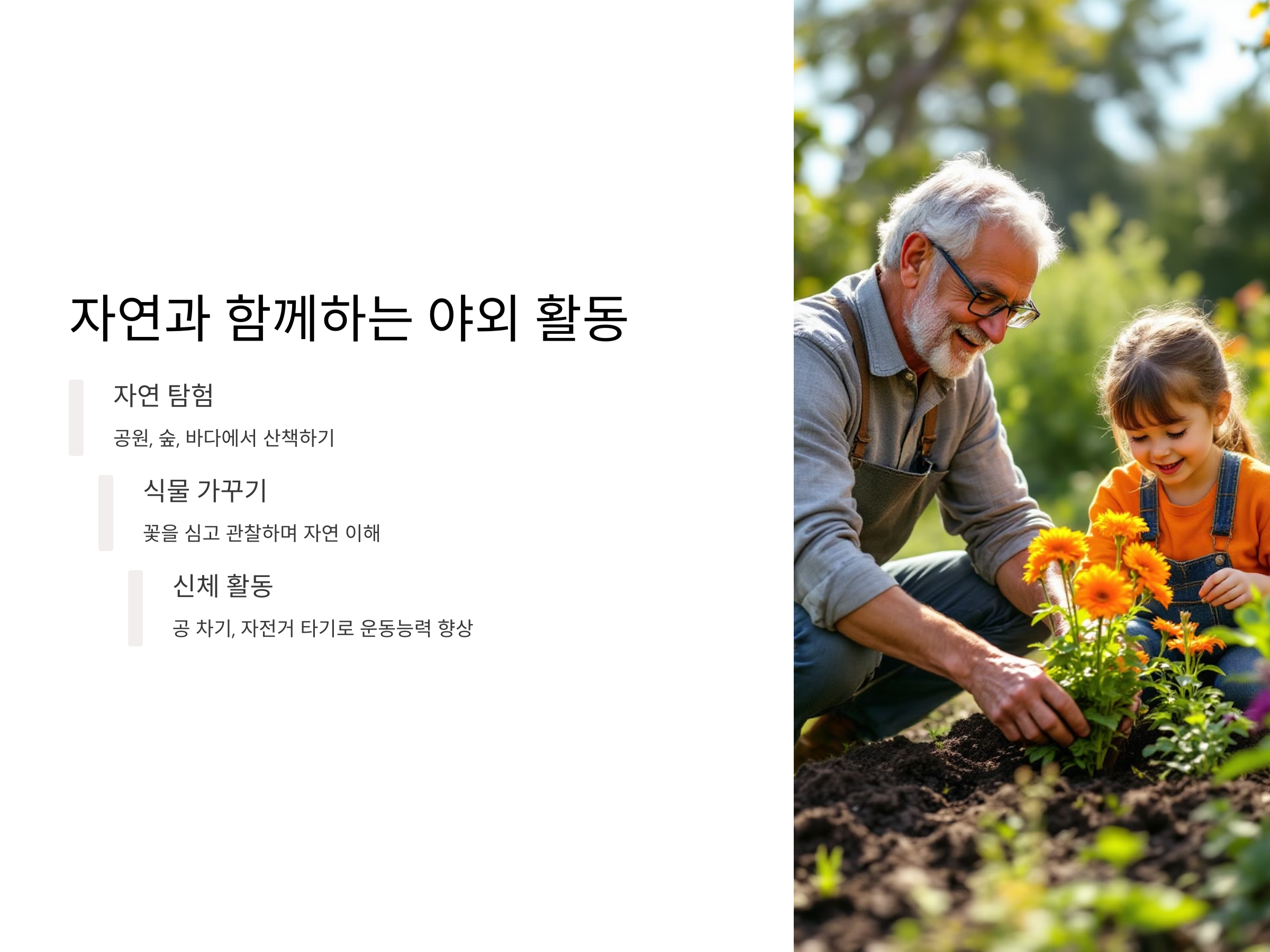 손주들과 함께 자연을 만끽하는 것도 좋은 취미 활동입니다. 공원이나 숲, 바다 등에서 산책을 하거나, 꽃을 심고 가꾸는 등 자연과 접할 수 있는 활동은 아이들에게 매우 유익합니다. 특히, 자연은 아이들에게 다양한 학습 기회를 제공합니다. 나무와 꽃의 이름을 배우거나, 작은 동물들을 관찰하며 자연의 법칙을 이해할 수 있습니다.