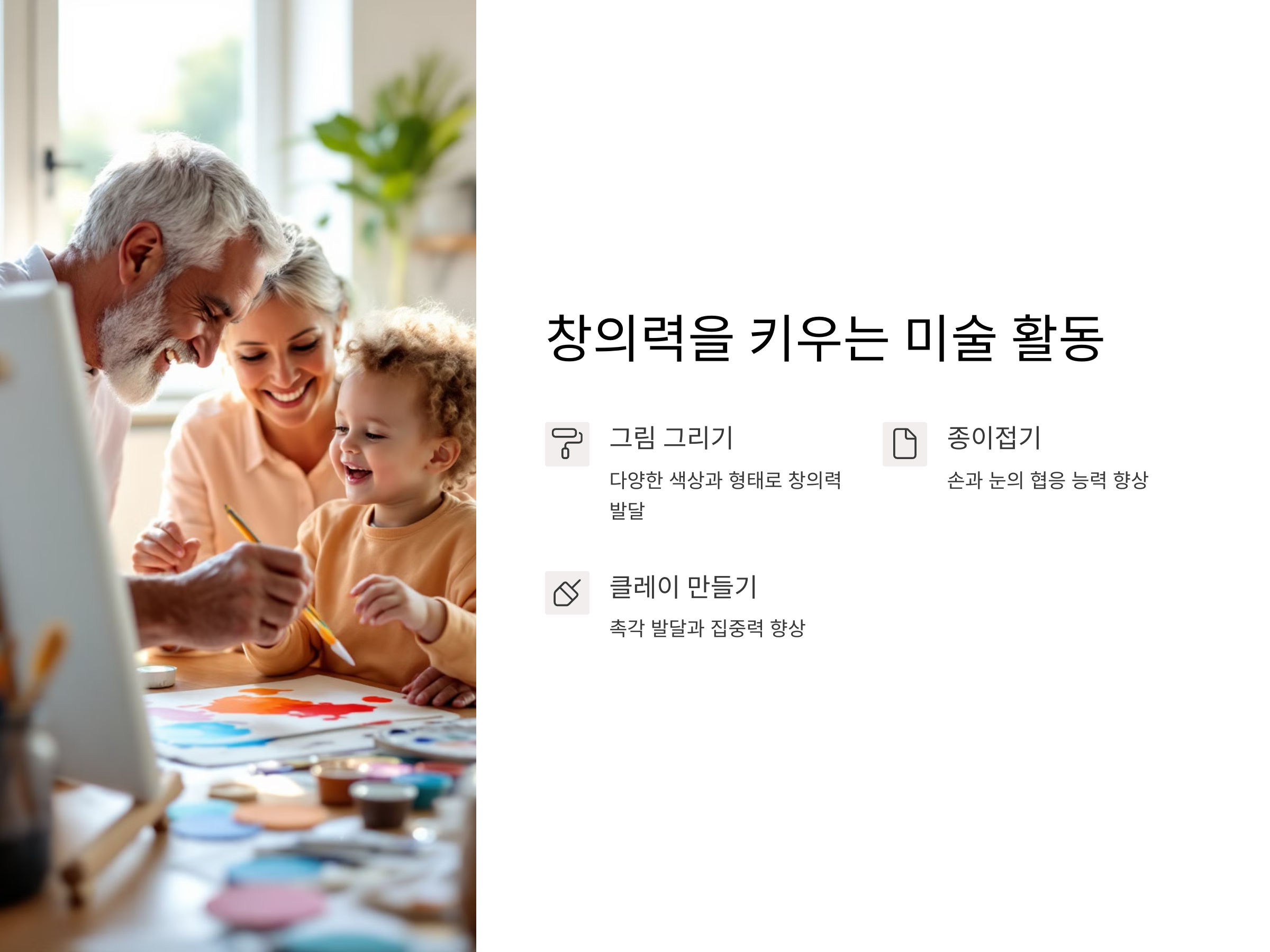 손주들과 함께 미술을 할 때는, 간단한 도구를 사용하여 재미있는 작품을 만들 수 있습니다. 예를 들어, 종이컵을 활용해 동물 모양을 만들거나, 작은 캔버스에 손을 이용해 그림을 그려보는 활동이 좋습니다. 이렇게 미술 활동을 하면서 서로의 작품에 대해 이야기하고, 아이들이 만든 작품을 칭찬해 주는 것은 아이들의 자아 존중감을 높이는 데 큰 도움이 됩니다.