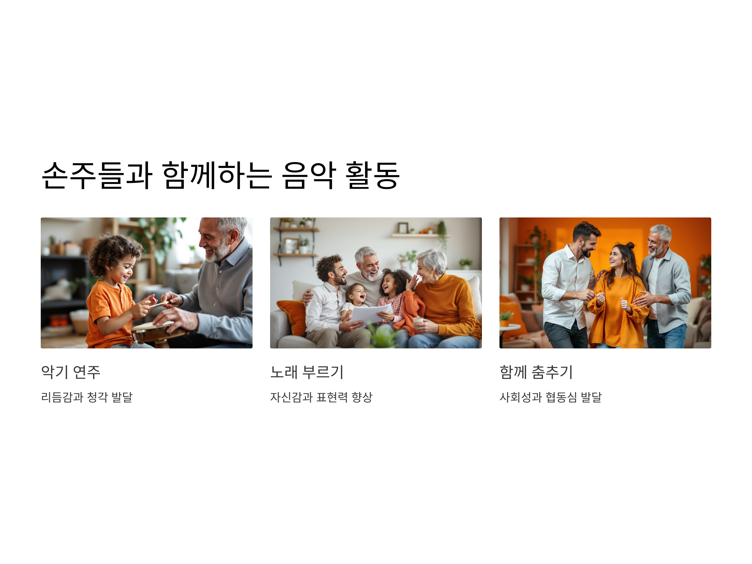간단한 악기인 캐스터네츠, 작은 드럼, 또는 실내악기와 함께 음악 활동을 시작할 수 있습니다. 음악과 함께하는 활동은 손주들이 보다 재미있고 즐겁게 참여할 수 있는 취미 활동으로, 가족 간의 유대감을 더욱 깊게 만들어줍니다.