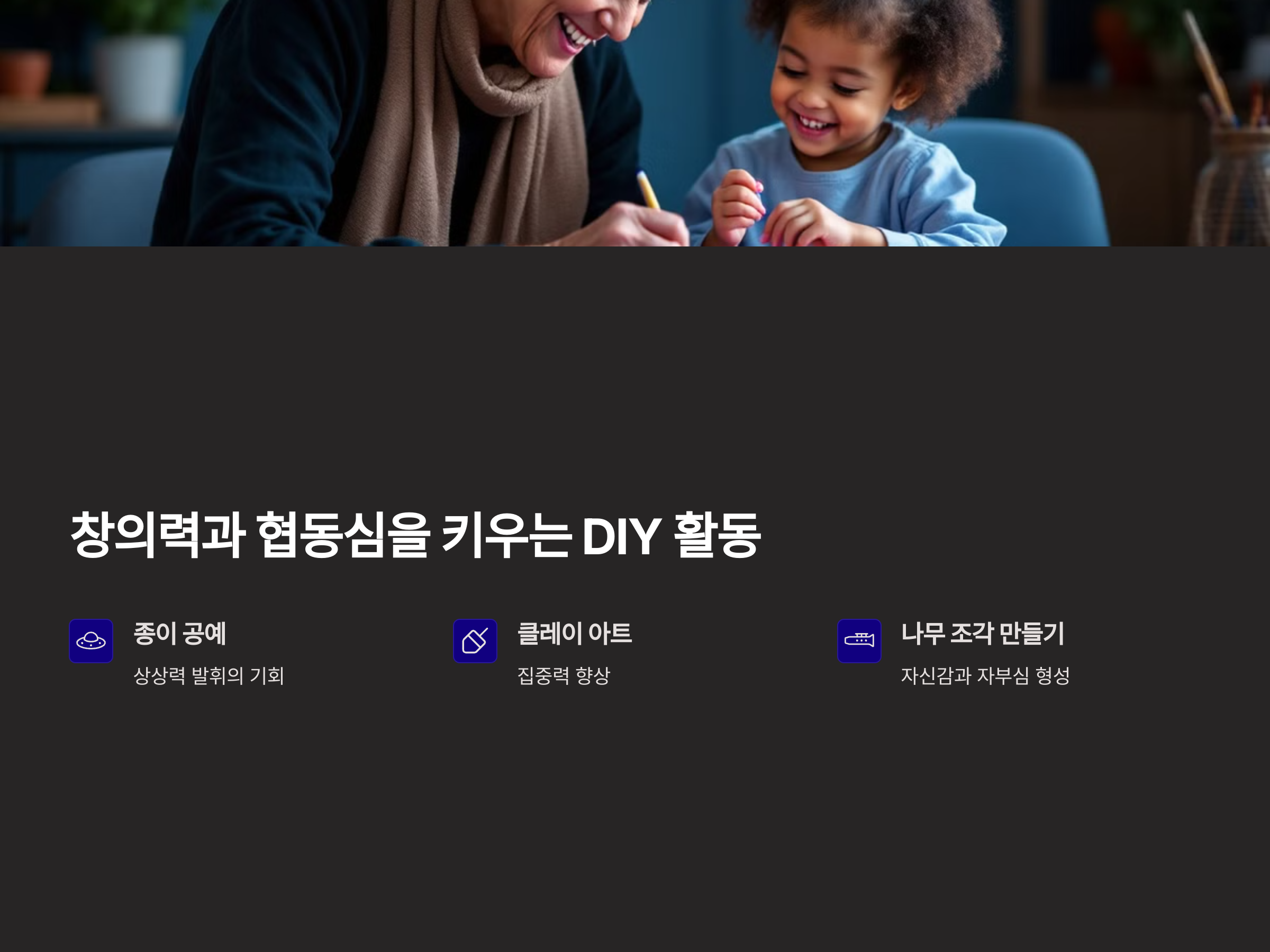 손주들과 함께 창의력과 협동심을 키울 수 있는 DIY 활동은 아주 좋습니다. 함께 만들기를 통해 아이들에게 상상력과 창의력 발휘의 기회를 주고, 자연스럽게 팀워크를 배울 수 있는 좋은 시간이 될 수 있습니다. 예를 들어, 간단한 종이 공예나 클레이 아트, 나무 조각 만들기 등 다양한 공예 활동이 있습니다. 이런 활동들은 아이들이 집중하고, 창의적인 결과물을 만드는 과정에서 자신감을 키울 수 있게 해줍니다. 또한 완성된 작품을 함께 보며 자부심을 느낄 수 있죠.