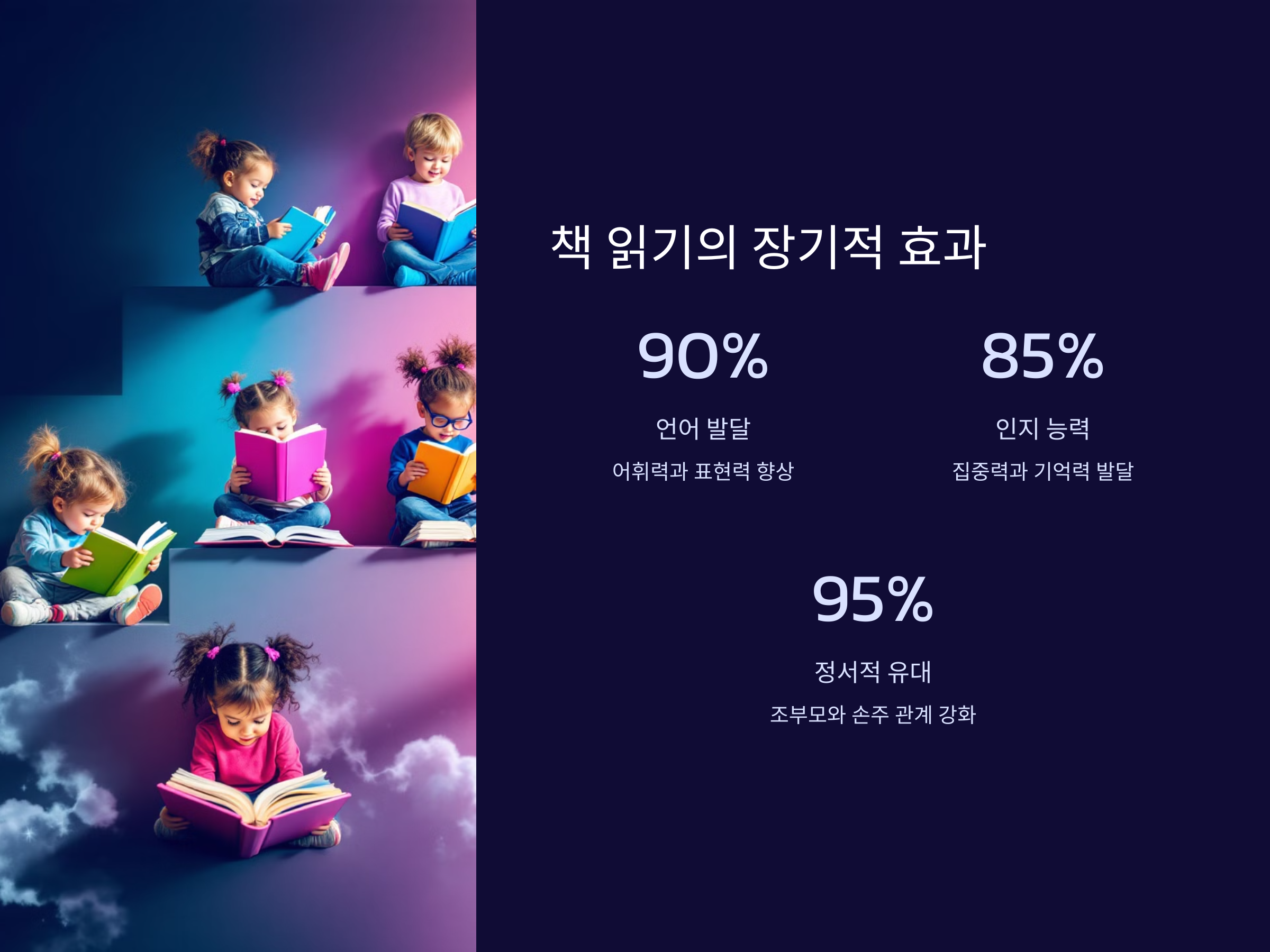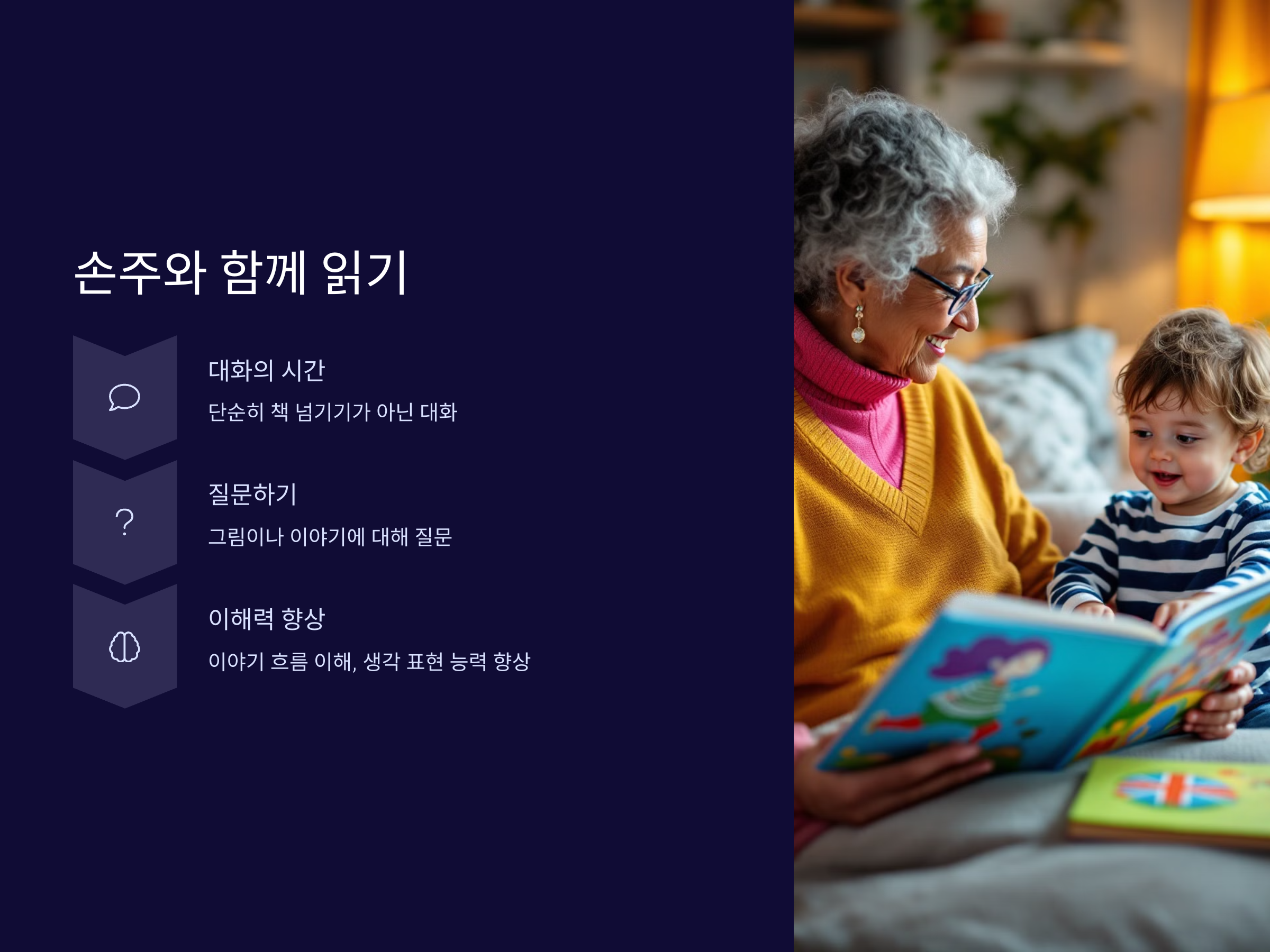 이렇게 대화를 통해 책을 읽는 습관을 기르게 되면, 손주들은 단순히 내용을 기억하는 것이 아니라 이야기의 흐름을 이해하고, 자기 생각을 표현하는 능력도 키울 수 있습니다.