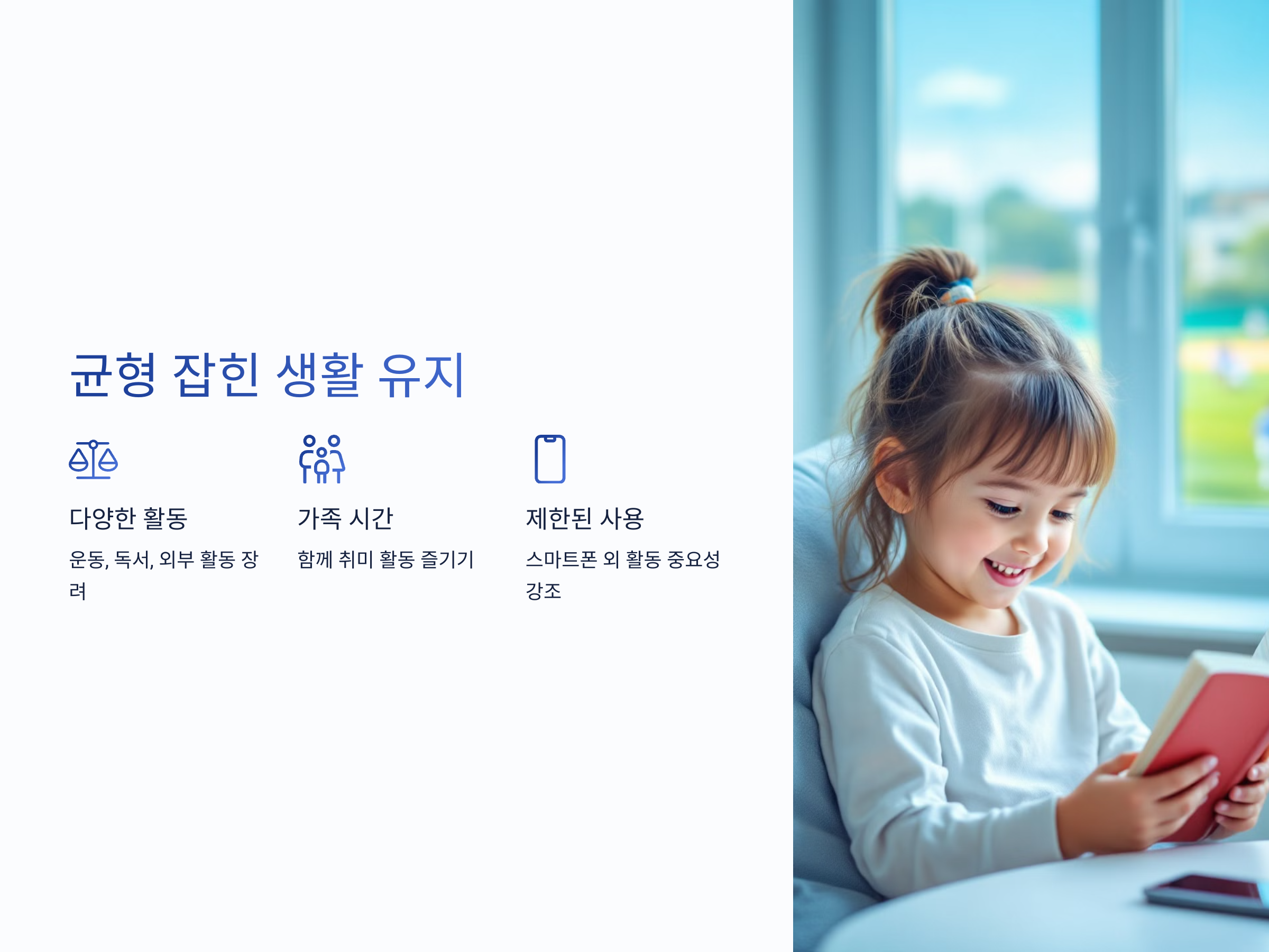 스마트폰을 사용할 때 가장 중요한 것은 균형입니다. 손주에게 스마트폰을 너무 제한하거나 반대로 무제한 사용을 허용하는 것은 좋지 않습니다. 스마트폰 외에도 다양한 활동을 할 수 있는 기회를 주어야 합니다. 예를 들어, 운동, 독서, 외부 활동 등을 통해 손주가 스마트폰과는 다른 활동에도 흥미를 가질 수 있도록 도와주세요.
