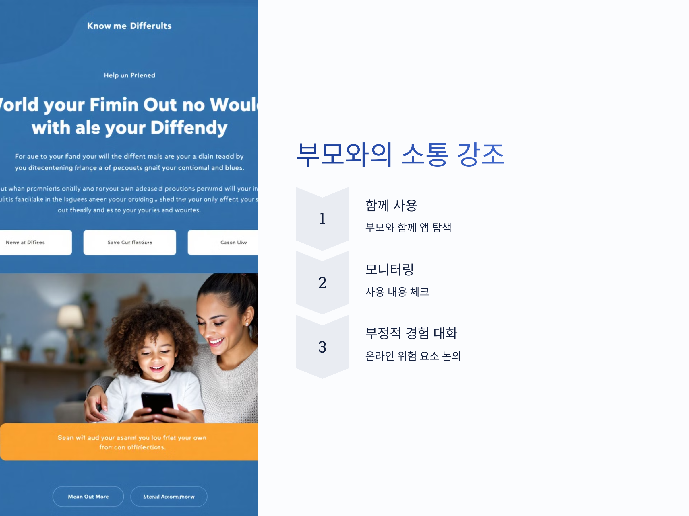 뿐만 아니라, 스마트폰에서 일어날 수 있는 부정적인 경험에 대해 부모가 적극적으로 이야기하는 것이 중요합니다. 예를 들어, 온라인 상에서의 부적절한 콘텐츠나 유해한 사이트로부터 손주를 보호할 수 있는 방법을 함께 이야기하면서 교육을 진행합니다.