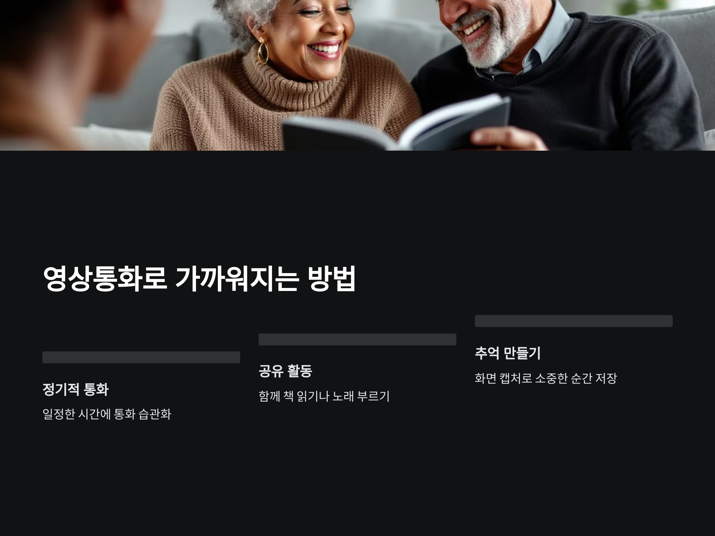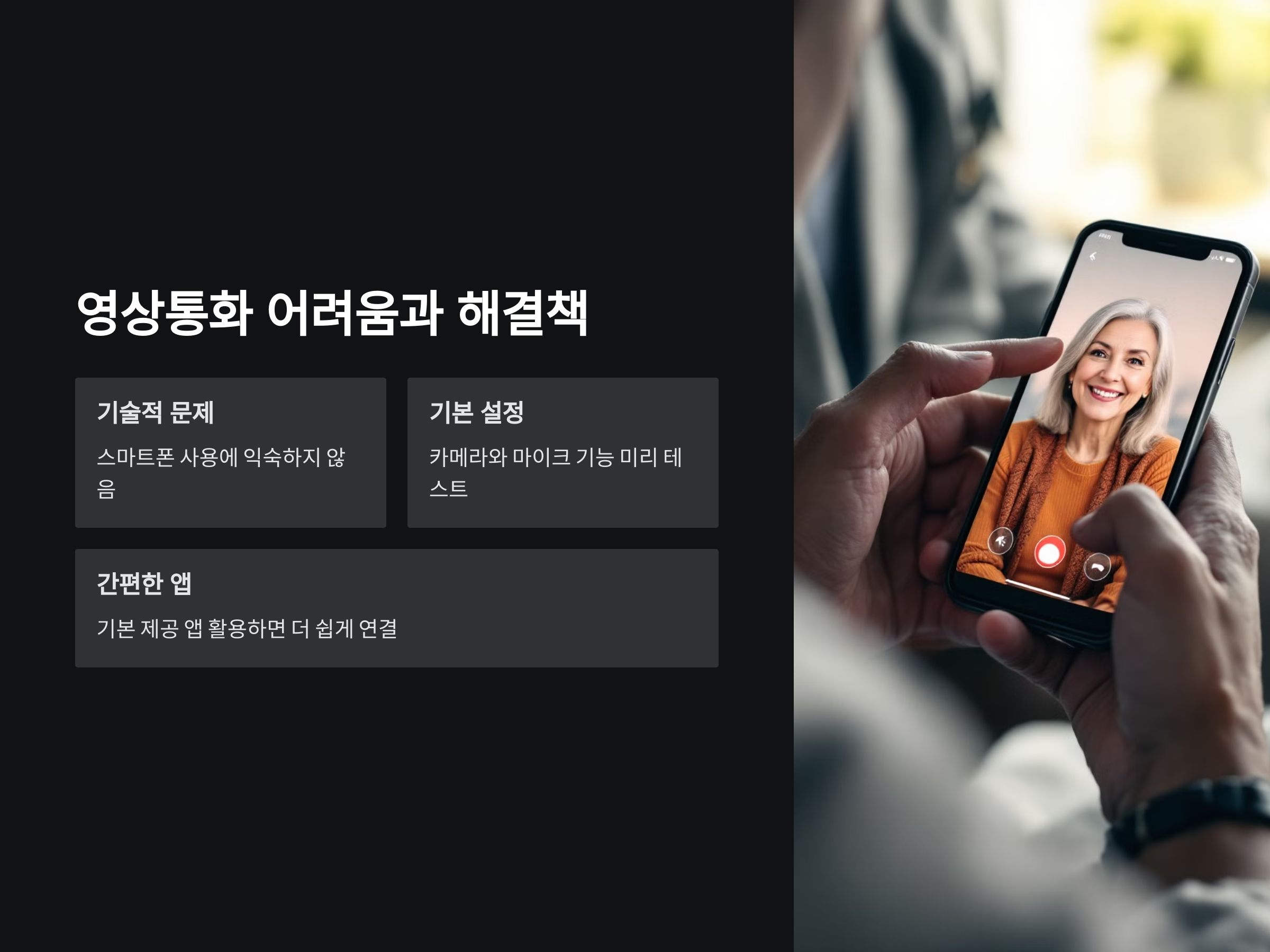 영상을 통해 소통할 때 가장 큰 문제는 기술적인 부분입니다. 특히 부모님이나 조부모님들이 스마트폰 사용에 익숙하지 않으면 영상통화가 어려운 일이 될 수 있습니다. 그럼 어떻게 해야 쉽게 영상통화를 할 수 있을까요?