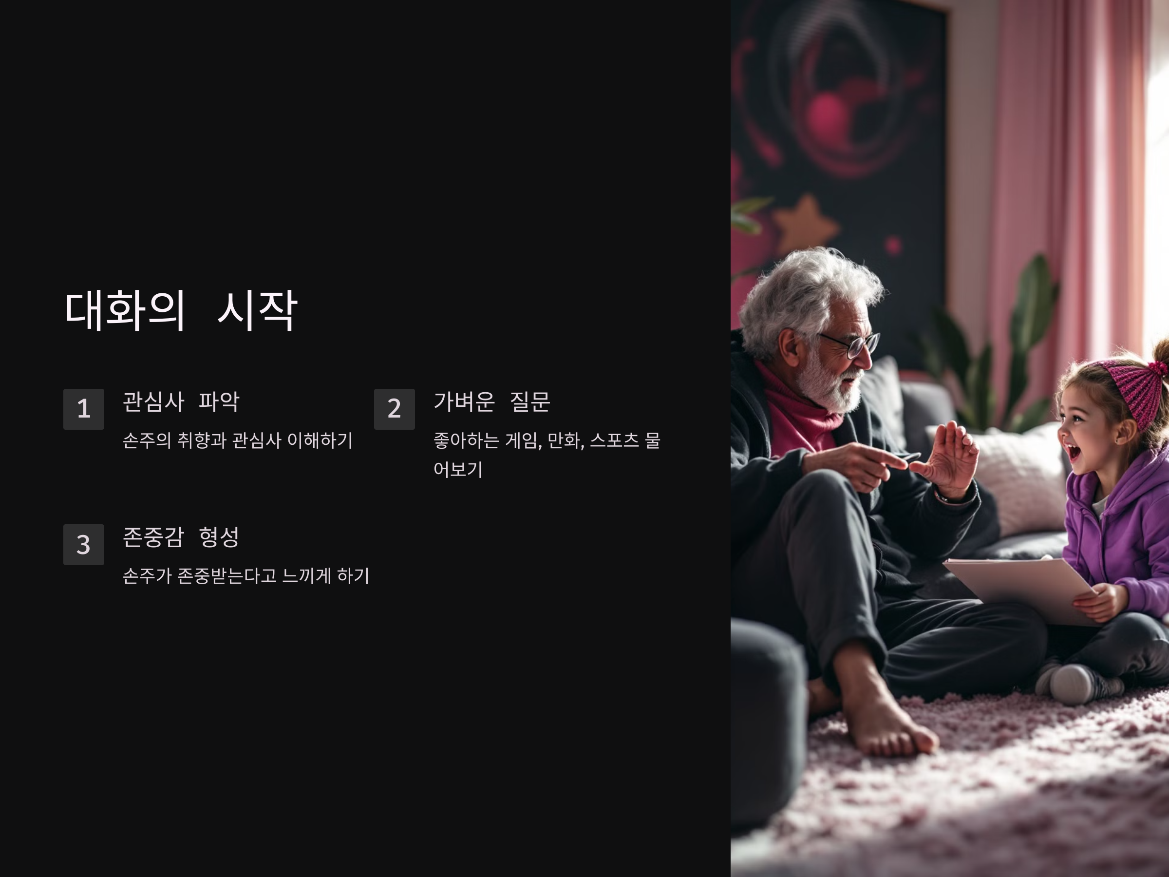 예를 들어, 손주가 좋아하는 게임이나 만화, 스포츠 등에 대해 이야기를 나누면 자연스럽게 친밀감을 느낄 수 있습니다. "요즘 어떤 게임 하고 있어?" 또는 "최근에 본 만화가 뭐야?"와 같이 가벼운 질문으로 시작해보세요. 손주는 자신의 관심사에 대해 이야기할 때 흥미를 느끼고, 자연스럽게 대화가 이어질 것입니다.