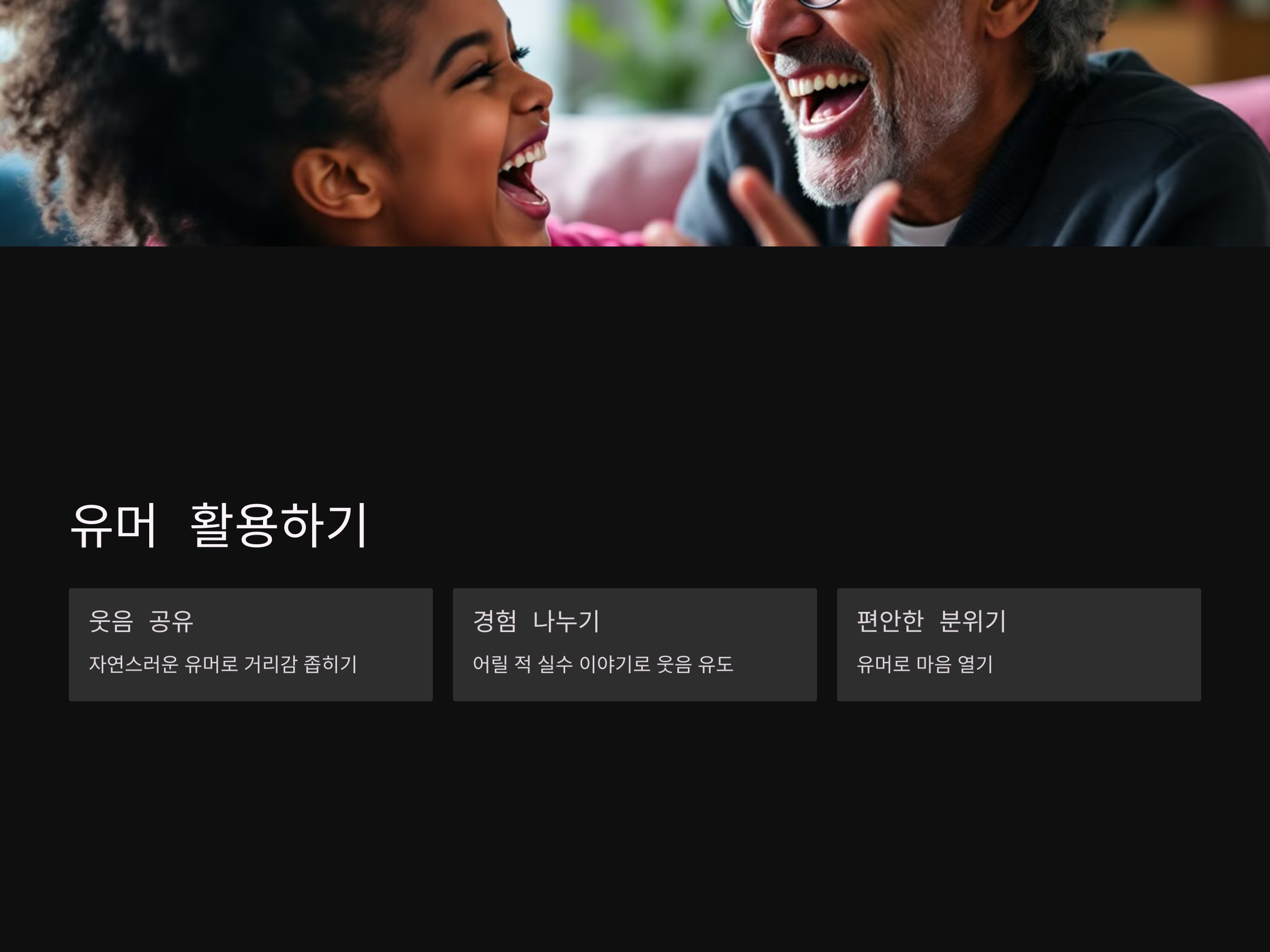 손주와의 대화에서 유머는 매우 중요한 역할을 합니다. 유머를 적절히 활용하면 대화가 더욱 즐겁고 편안하게 이루어지며, 손주와의 거리감을 좁힐 수 있습니다. 물론, 유머가 지나치면 부담을 줄 수 있으므로 자연스럽게 웃음을 자아낼 수 있는 말을 건네는 것이 좋습니다.