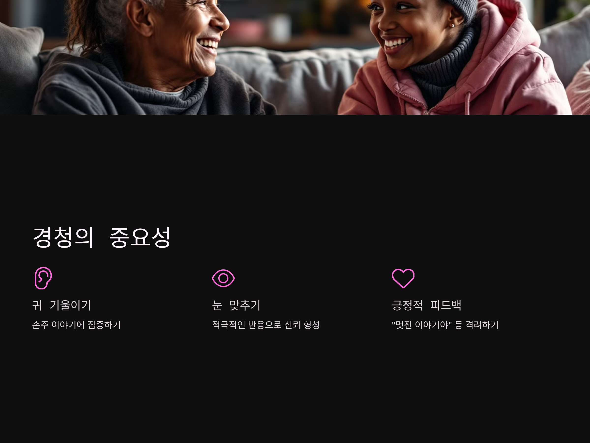 손주와의 관계에서 가장 중요한 요소 중 하나는 바로 경청입니다. 손주가 이야기할 때, 그들의 말을 귀 기울여 듣는 것이 중요합니다. 특히, 손주는 자신의 감정을 표현하고 싶어하는데, 이를 귀 기울여 듣는 것만으로도 그들은 큰 만족감을 느낍니다. "정말 멋진 이야기를 했네" 또는 "그렇게 생각하는구나"와 같은 긍정적인 피드백을 주는 것도 좋은 방법입니다.