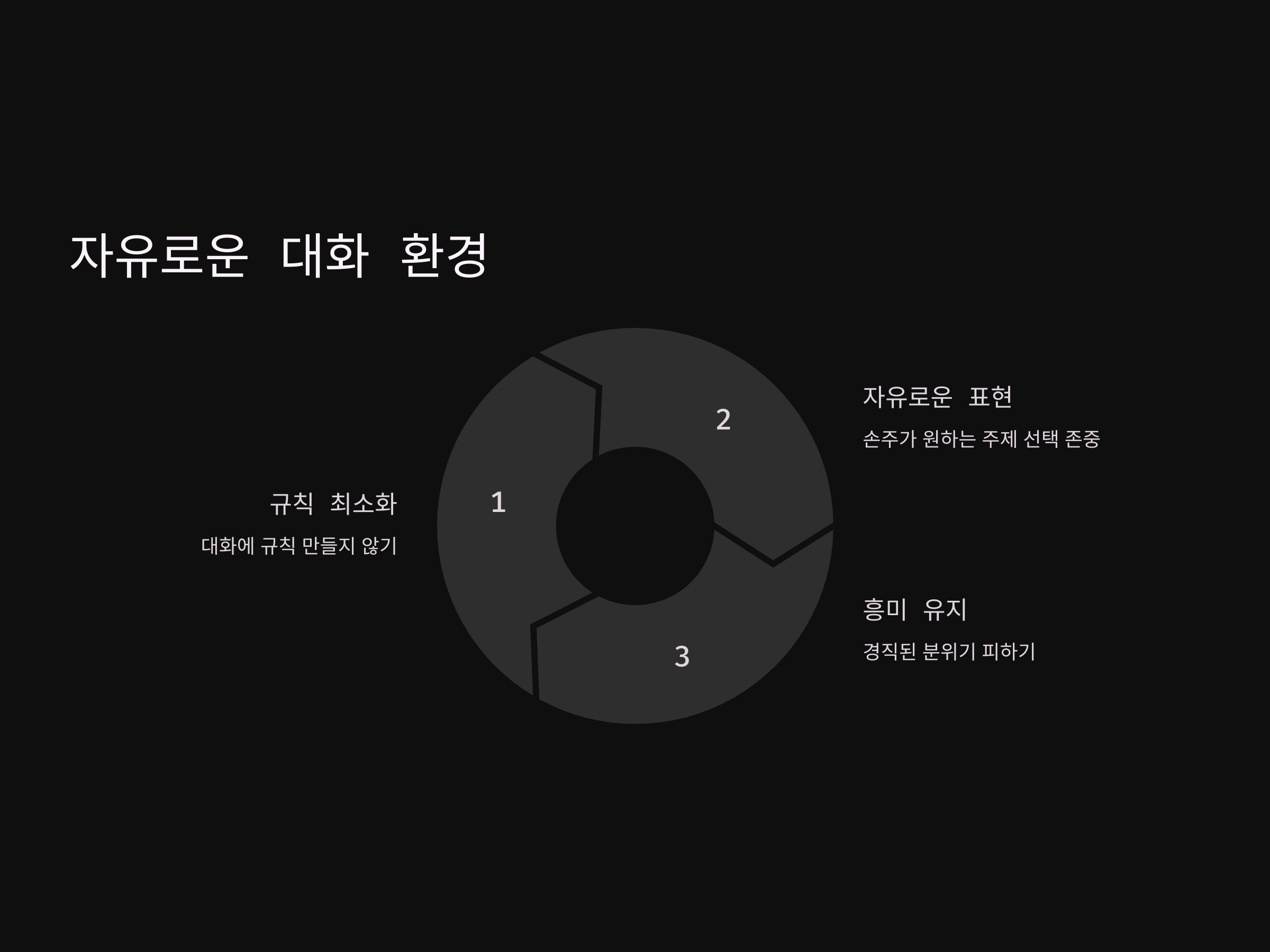 대화는 규칙에 얽매이지 않고 자유롭게 흐르도록 하는 것이 중요합니다. 손주가 이야기하고 싶은 것에 대해 자유롭게 말할 수 있는 환경을 만들어 주는 것이 더욱 효과적입니다.
