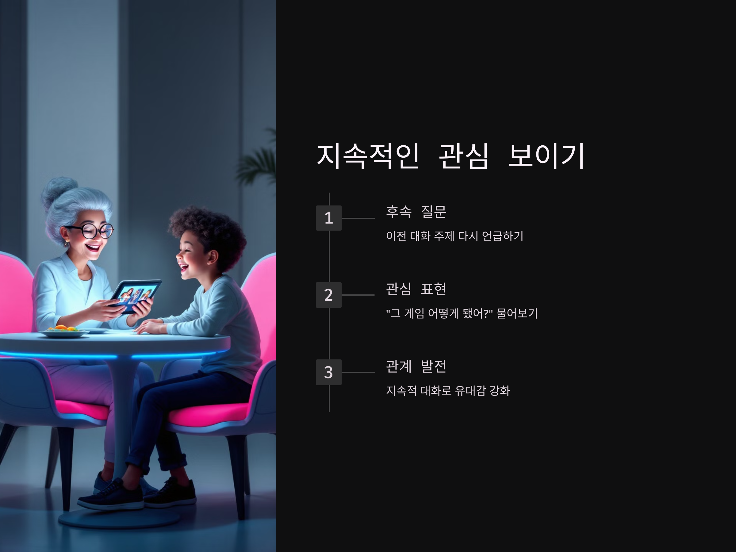 "지난번에 얘기했던 그 게임, 어떻게 됐어?" 또는 "그 만화 다시 보고 있어?"와 같은 질문으로 후속 대화를 이끌어 나가세요. 이를 통해 손주와의 관계는 더욱 자연스럽고 지속적으로 발전할 수 있습니다.