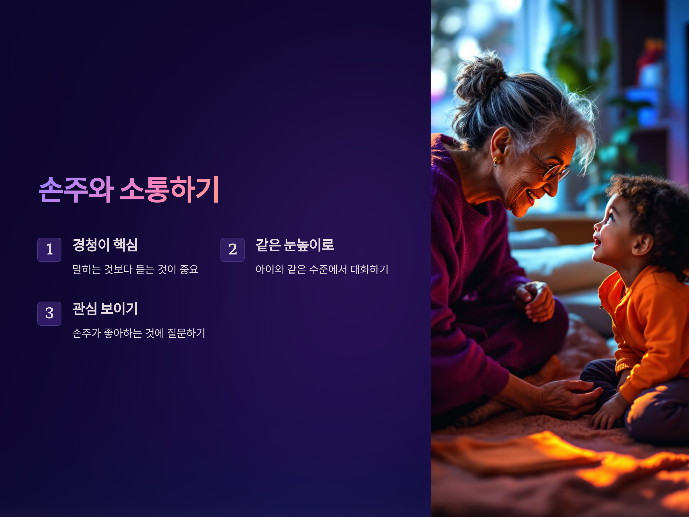 - 손주가 말할 때는 끊지 말고 끝까지 듣는 자세가 필요합니다.