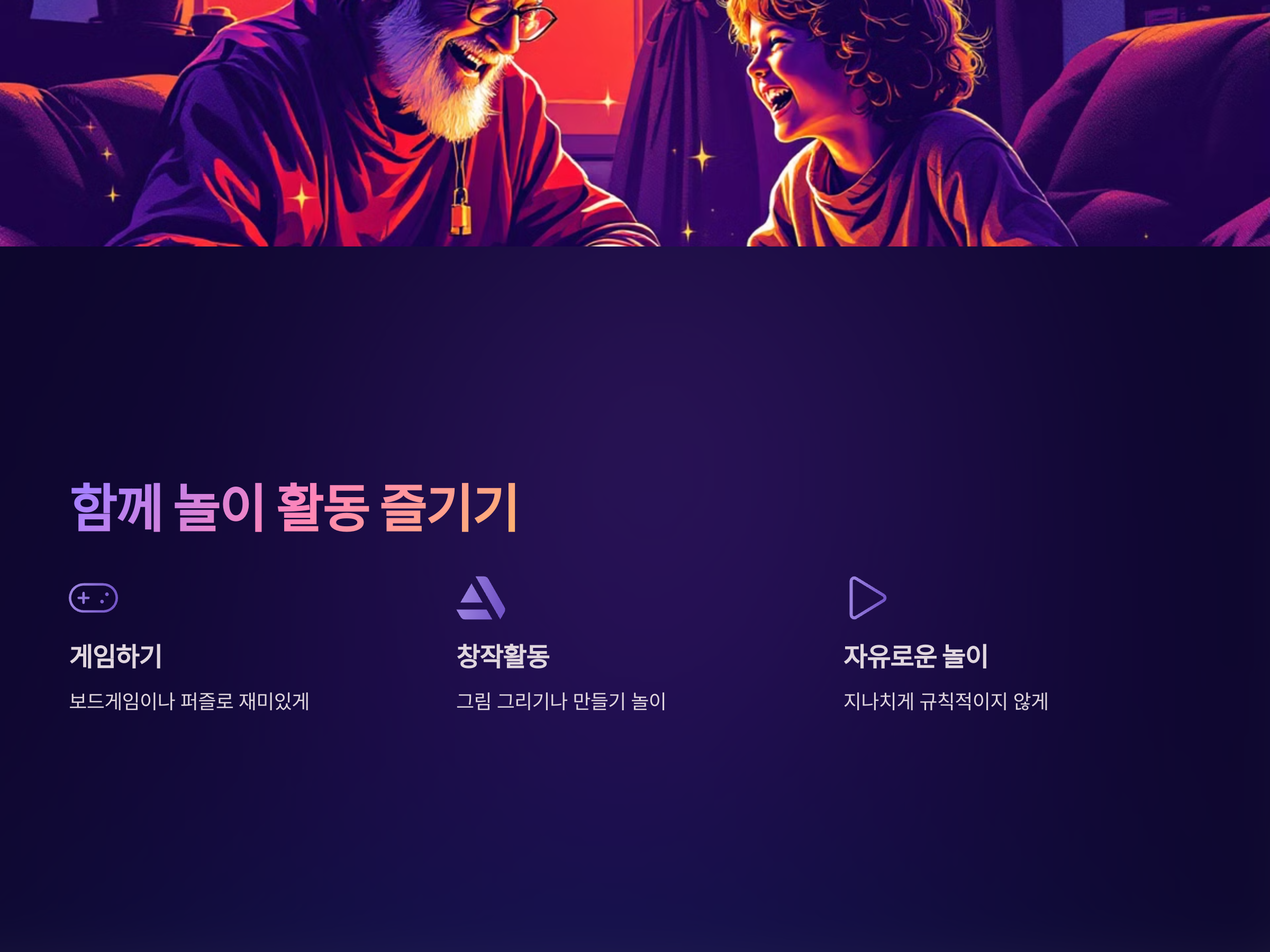 손주와의 관계에서 놀이 활동은 매우 중요한 역할을 합니다. 놀이를 통해 손주는 재미있고 즐거운 경험을 하고, 조부모와 함께하는 시간을 특별하게 느낄 수 있습니다. 게임이나 운동은 아이와의 유대감을 형성하는 데 좋은 도구입니다.