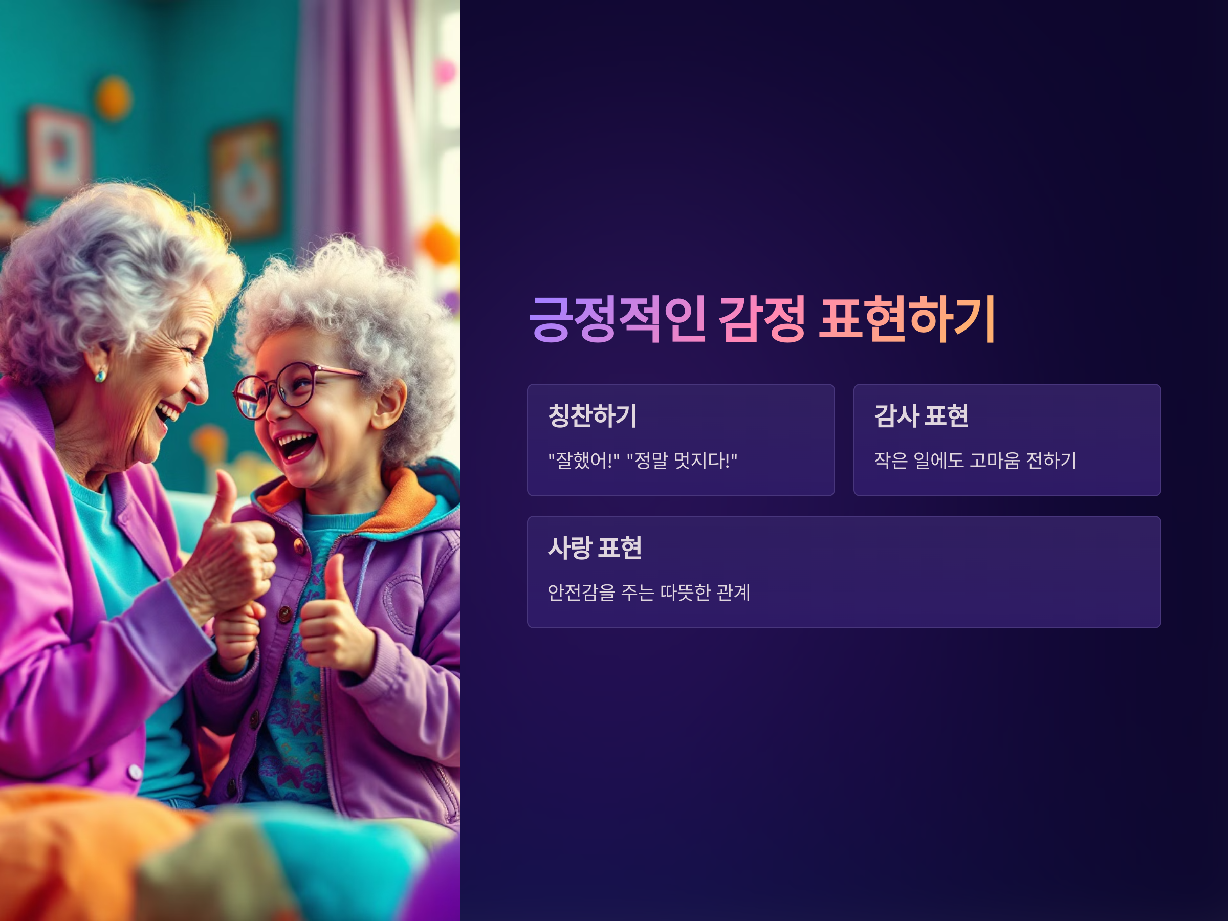 "잘했어!" "정말 멋지다!"와 같은 칭찬은 손주에게 큰 자신감을 주며, 이러한 긍정적인 피드백을 받을 때 손주는 더욱 열린 마음으로 다가오게 됩니다. 부정적인 말을 줄이고, 긍정적인 감정을 자주 표현하는 것이 중요합니다.