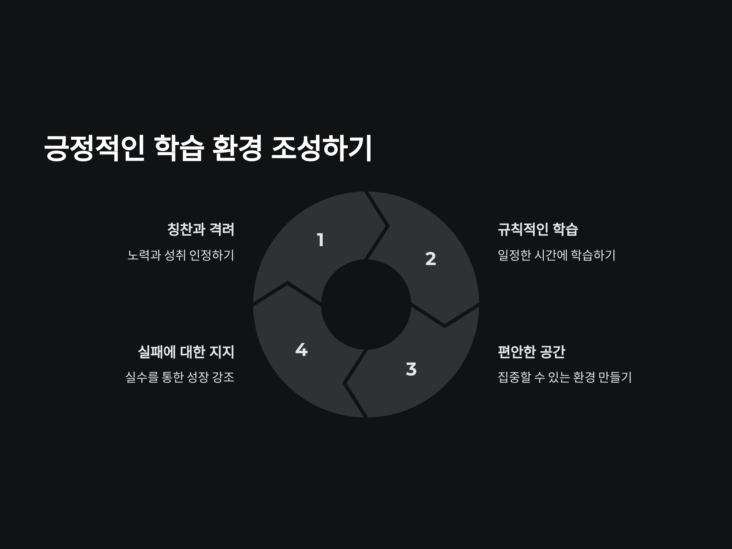 아이들이 한글 학습에 흥미를 가지고 지속적으로 학습할 수 있도록 긍정적인 학습 환경을 조성하는 것이 중요합니다. 아이의 노력과 성취를 인정하고 칭찬해주며, 실패나 실수에 대해 격려해주는 태도가 필요합니다. 또한, 학습 시간을 규칙적으로 정하고, 학습 공간을 편안하고 집중할 수 있도록 꾸며주는 것도 도움이 됩니다.