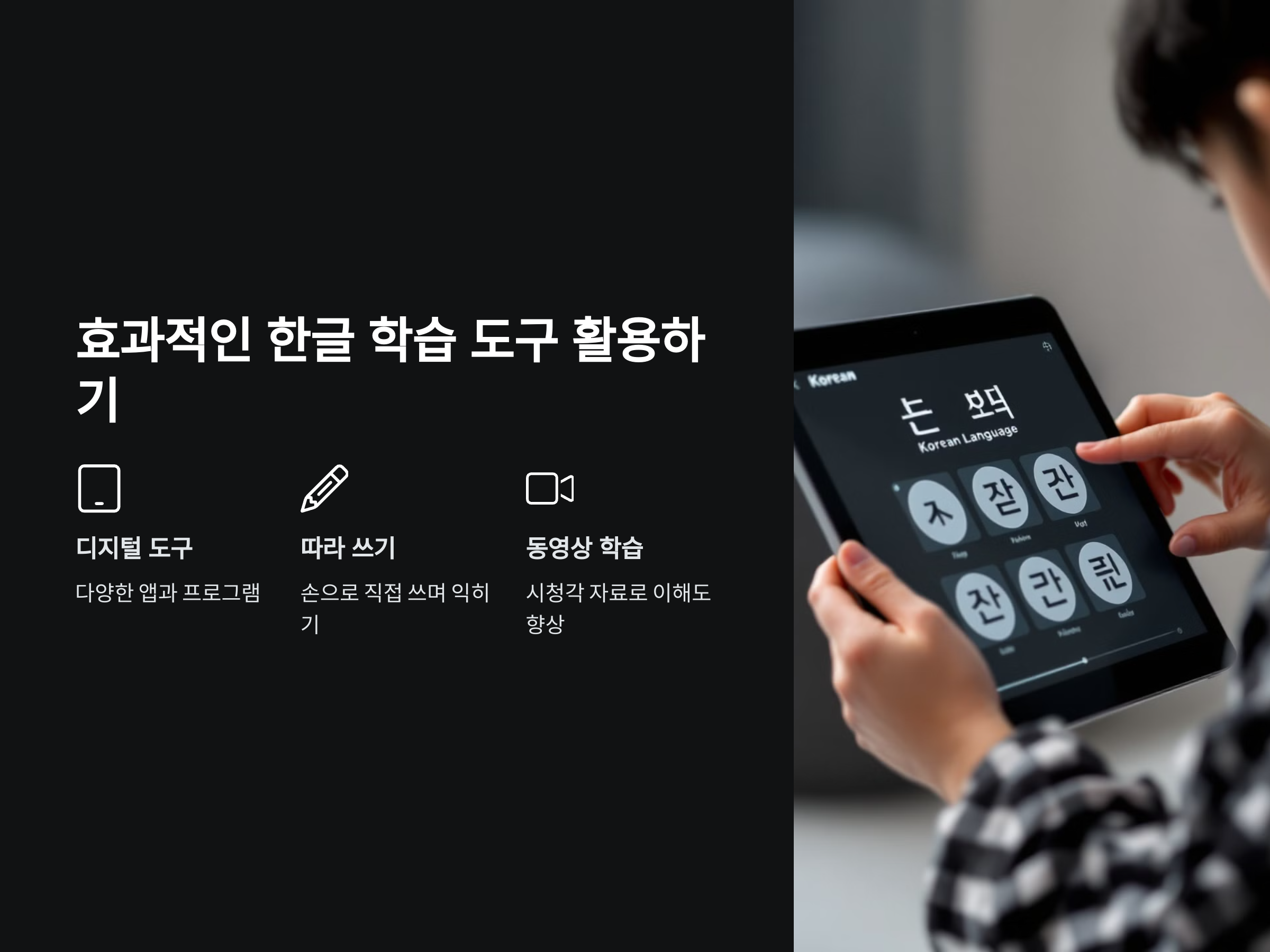 현대에는 다양한 디지털 도구와 어플리케이션이 아이들의 한글 학습을 돕고 있습니다. 예를 들어, '허당 문선생의 한글교실'은 따라 쓰기, 단어 카드, 동영상 학습 등 다양한 기능을 제공하여 아이들이 재미있게 한글을 배울 수 있도록 도와줍니다. 이러한 어플리케이션은 아이들의 학습 수준과 흥미에 맞게 조절할 수 있어 개인 맞춤형 학습이 가능합니다.