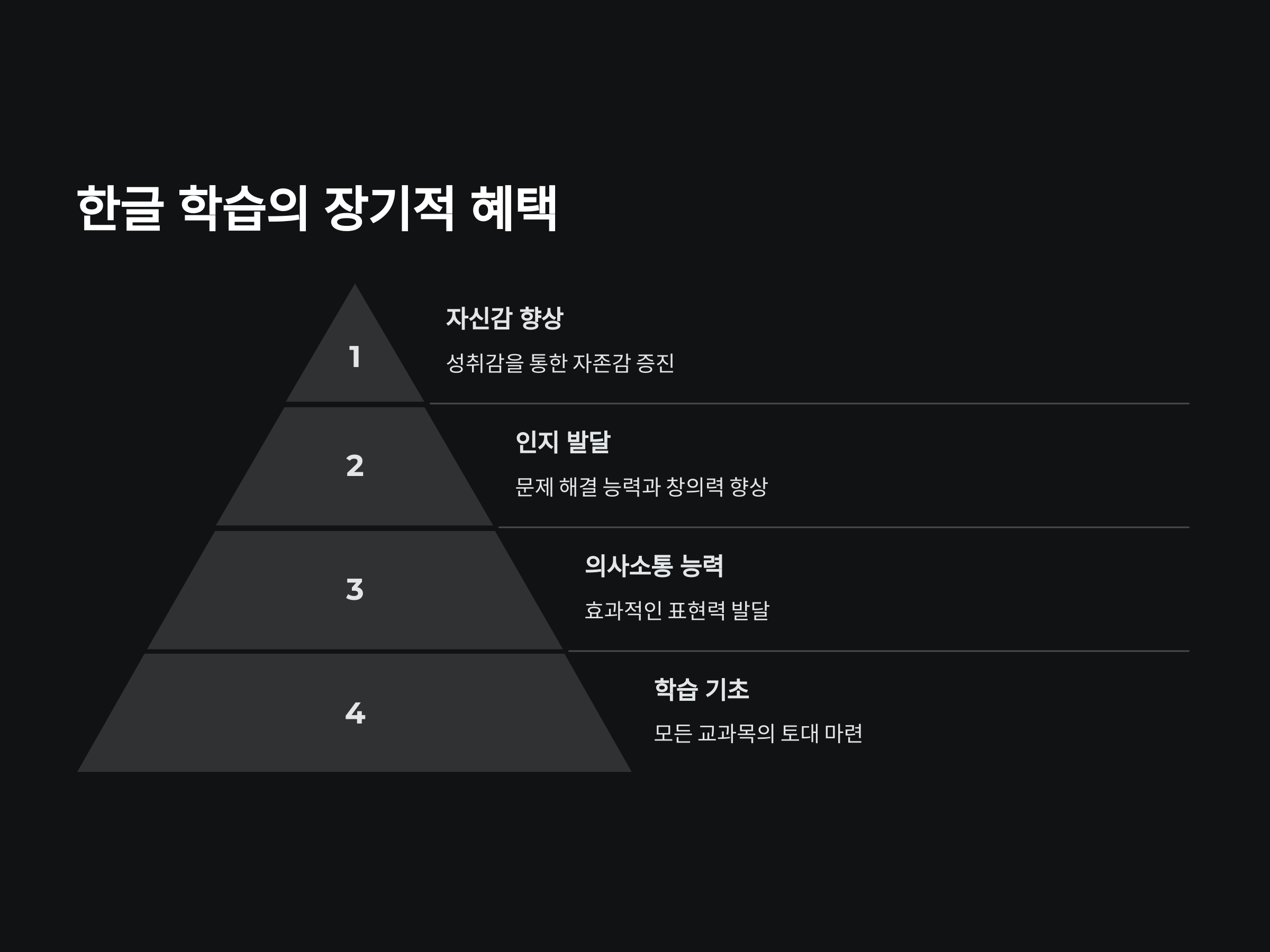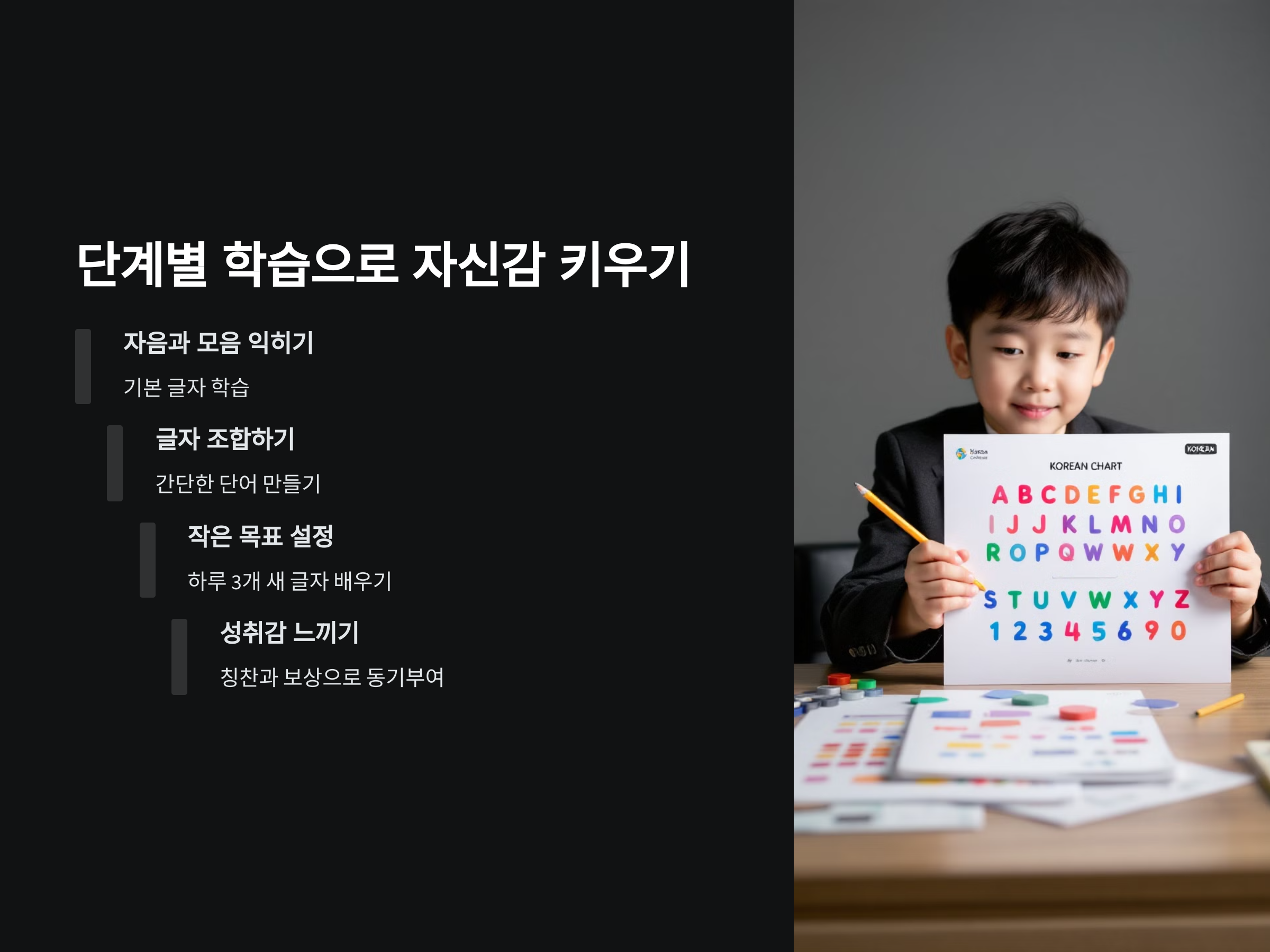 한글 학습은 단계별로 진행하는 것이 중요합니다. 먼저 자음과 모음을 익힌 후, 이를 조합하여 단어를 만들어 보는 연습을 합니다. 이 과정에서 아이가 성취감을 느끼고 자신감을 가질 수 있도록 작은 목표를 설정해주는 것이 좋습니다. 예를 들어, 하루에 새로운 글자 3개를 배우기로 하고, 이를 성공적으로 익혔을 때 칭찬과 보상을 해주는 방법이 있습니다.