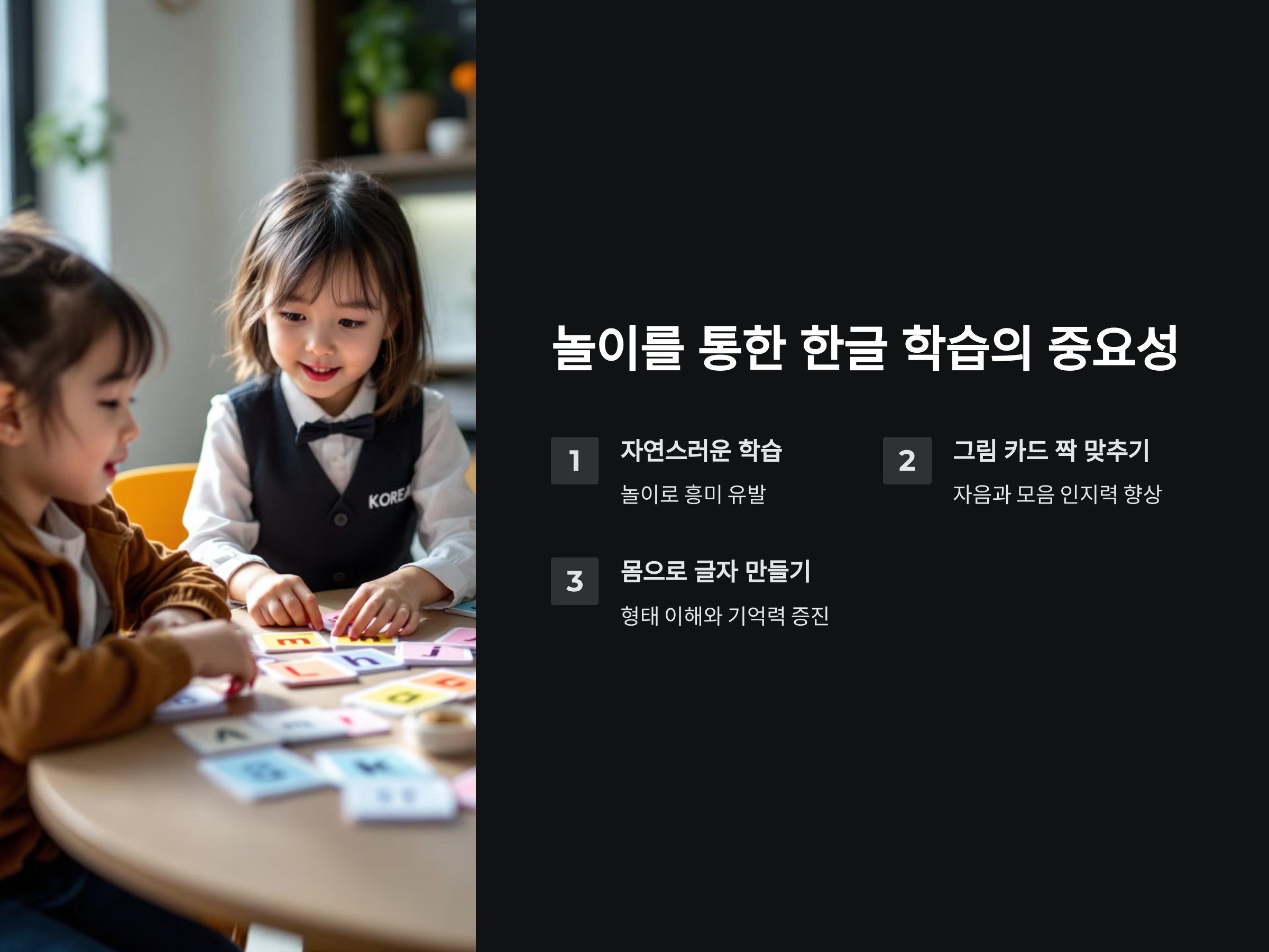 아이들은 놀이를 통해 세상을 배우고 탐구합니다. 놀이와 학습을 결합하면 아이들은 자연스럽게 학습에 대한 흥미를 가지게 됩니다. 예를 들어, 그림 카드 짝 맞추기 놀이는 아이들이 자음과 모음을 인지하고 짝을 맞추는 능력을 향상시킵니다. 또한, 몸으로 글자 만들기와 같은 신체 활동은 아이들이 글자의 형태를 이해하고 기억하는 데 도움이 됩니다. 이러한 놀이 기반 학습은 아이들의 창의력과 문제 해결 능력을 향상시키는 데도 기여합니다.