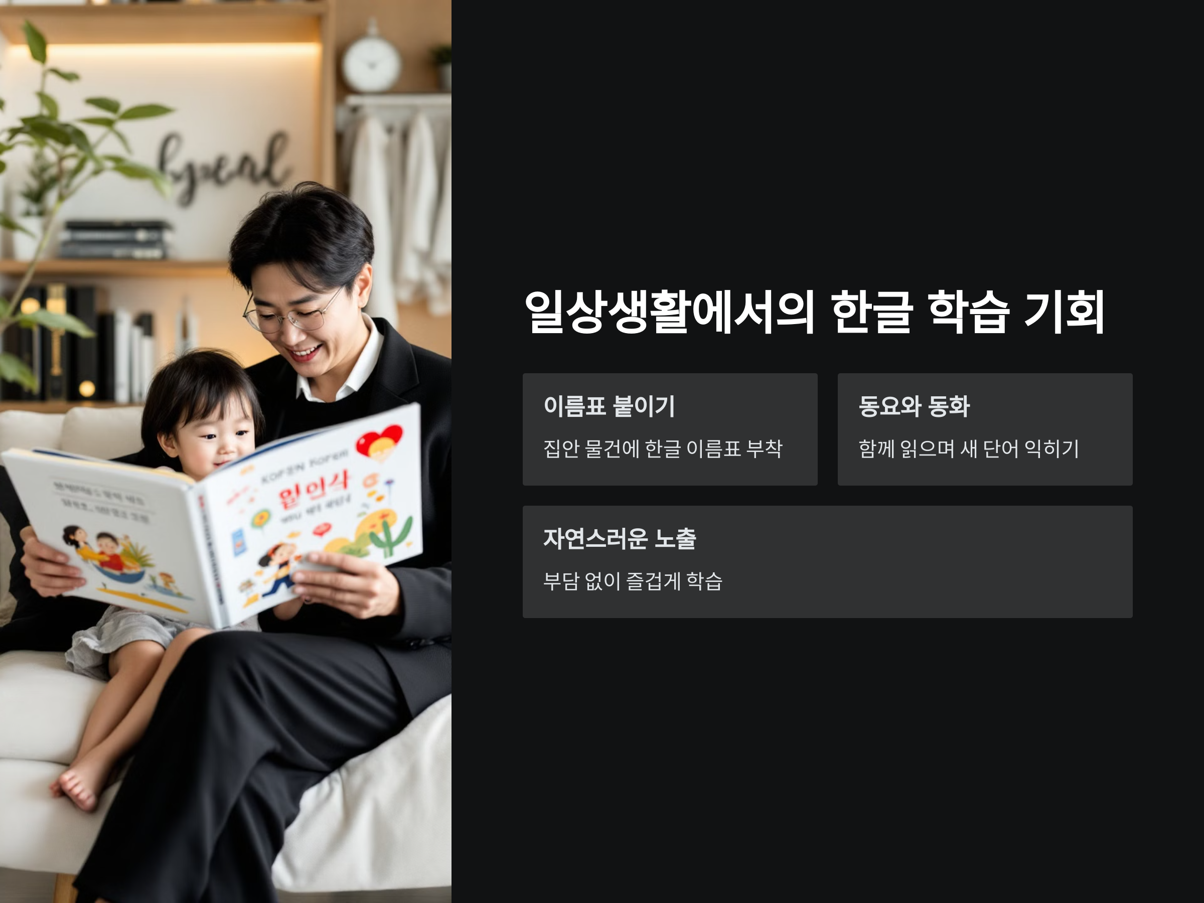 일상생활 속에서 자연스럽게 한글을 접하는 것은 아이들의 학습에 큰 도움이 됩니다. 예를 들어, 집안의 물건에 이름표를 붙여 아이가 글자와 사물을 연결하도록 도와줄 수 있습니다. 또한, 간단한 동요나 동화를 함께 읽으며 새로운 단어와 표현을 익히는 것도 효과적입니다. 이러한 방법은 아이들이 학습에 대한 부담 없이 즐겁게 한글을 익힐 수 있도록 도와줍니다.
