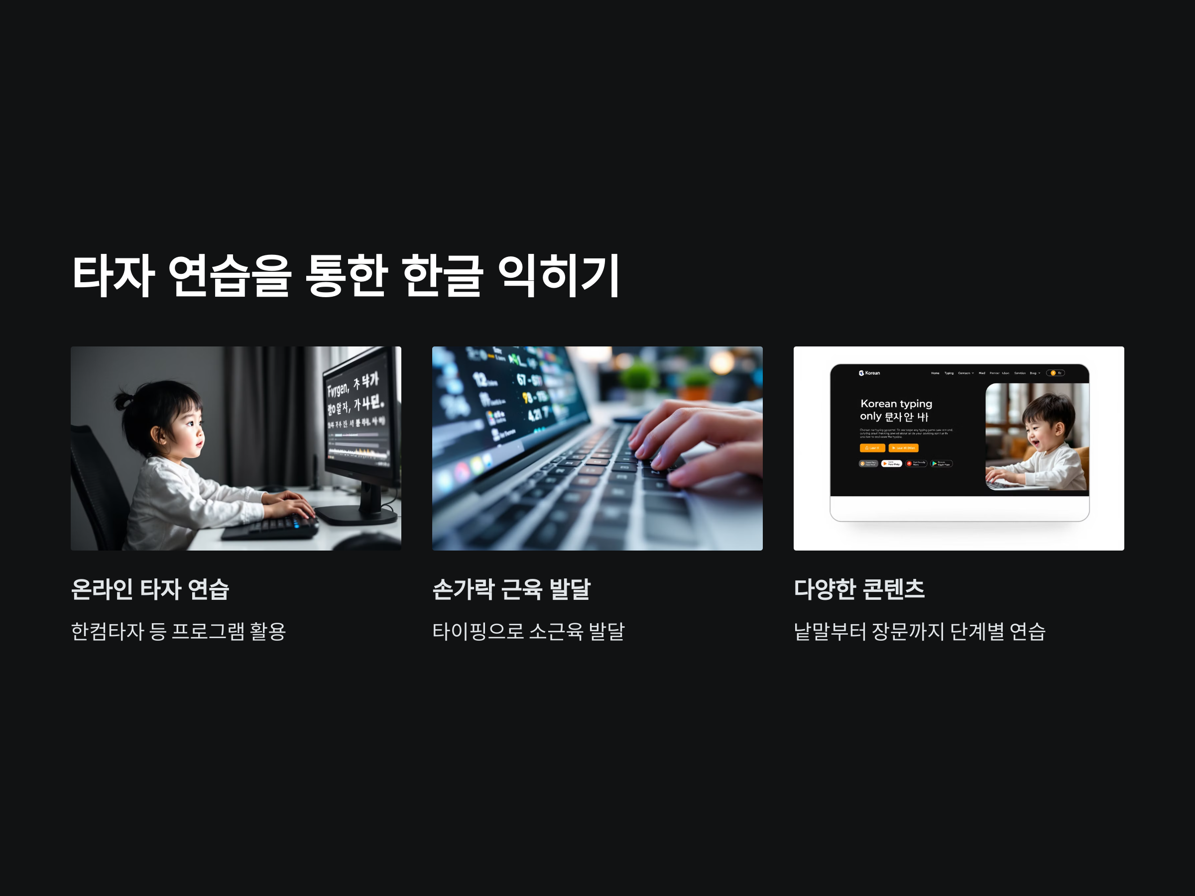 디지털 시대에 맞춰 타자 연습을 통해 한글을 익히는 것도 좋은 방법입니다. '한컴타자'와 같은 온라인 타자 연습 프로그램은 자리 연습부터 낱말, 단문, 장문 연습까지 다양한 콘텐츠를 제공하여 아이들이 재미있게 타자 실력을 향상시킬 수 있도록 도와줍니다. 이러한 프로그램은 아이들의 손가락 근육 발달과 함께 한글 자모의 위치를 익히는 데 도움이 됩니다.
