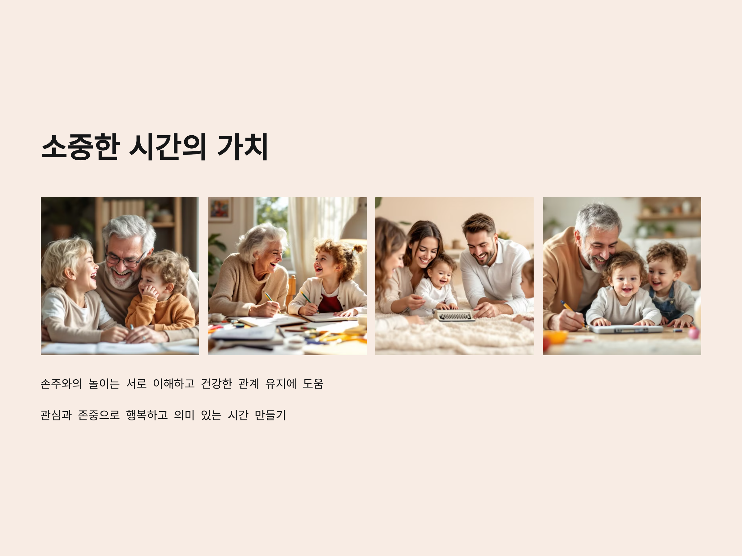 손주와 함께하는 놀이 시간은 가족 간의 소통을 촉진하고, 아이에게는 창의력과 문제 해결 능력을 키울 수 있는 기회를 제공합니다. 이러한 놀이를 통해 손주와 조부모 모두가 서로를 이해하고, 건강한 관계를 유지하는 데 큰 도움이 됩니다. 또한, 손주에게는 신체적, 정서적, 사회적 발달이 이루어지는 중요한 시간이 될 것입니다.