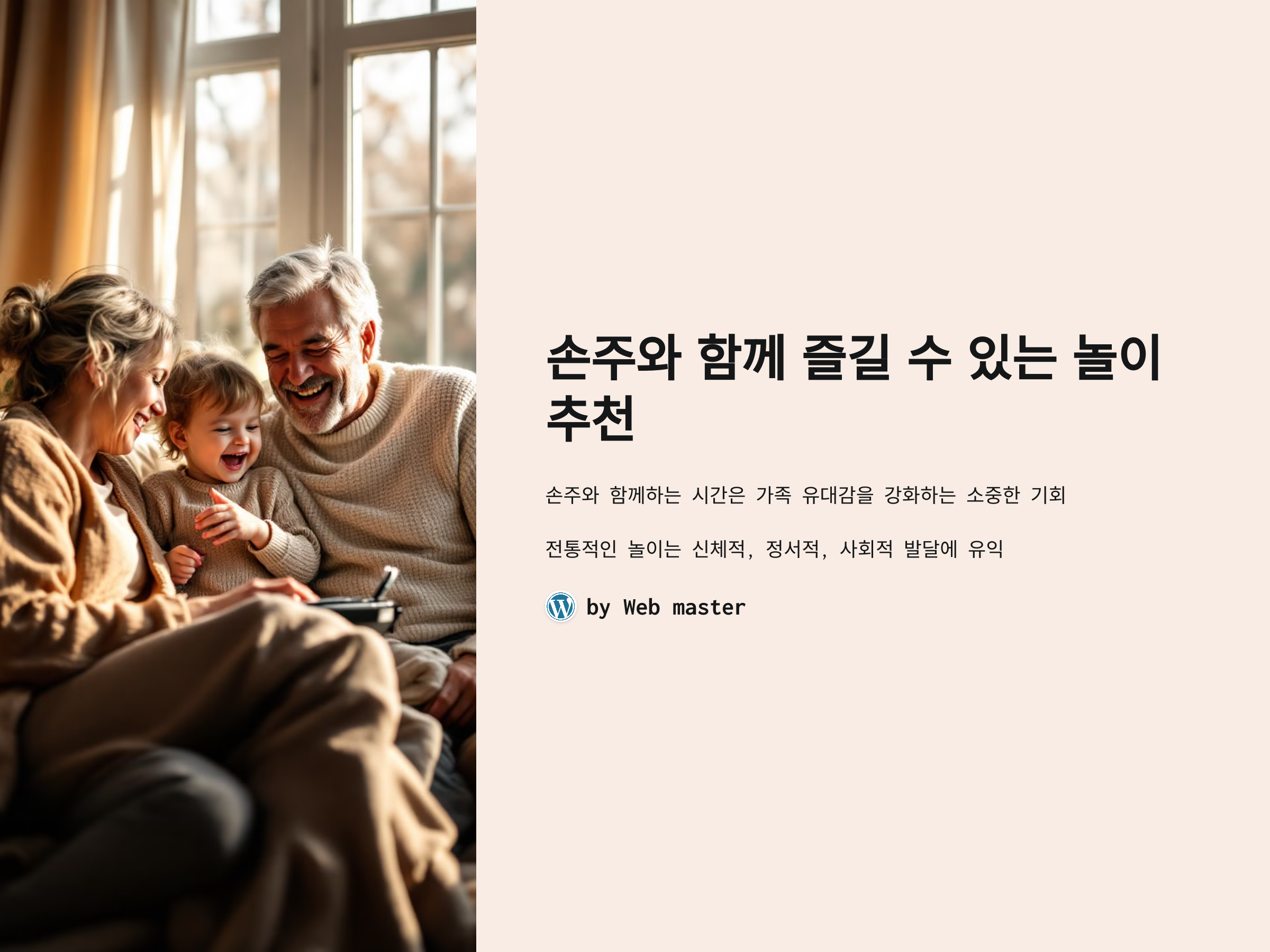 손주와 함께 보내는 시간은 정말 소중합니다. 그 시간은 가족 간의 유대감을 더 강화시킬 수 있는 기회가 되며, 아이에게는 중요한 학습과 놀이의 기회를 제공합니다. 조부모님이 손주와 함께 할 수 있는 놀이를 찾고 있다면, 아래의 추천 놀이들을 통해 즐겁고 의미 있는 시간을 보낼 수 있을 것입니다.