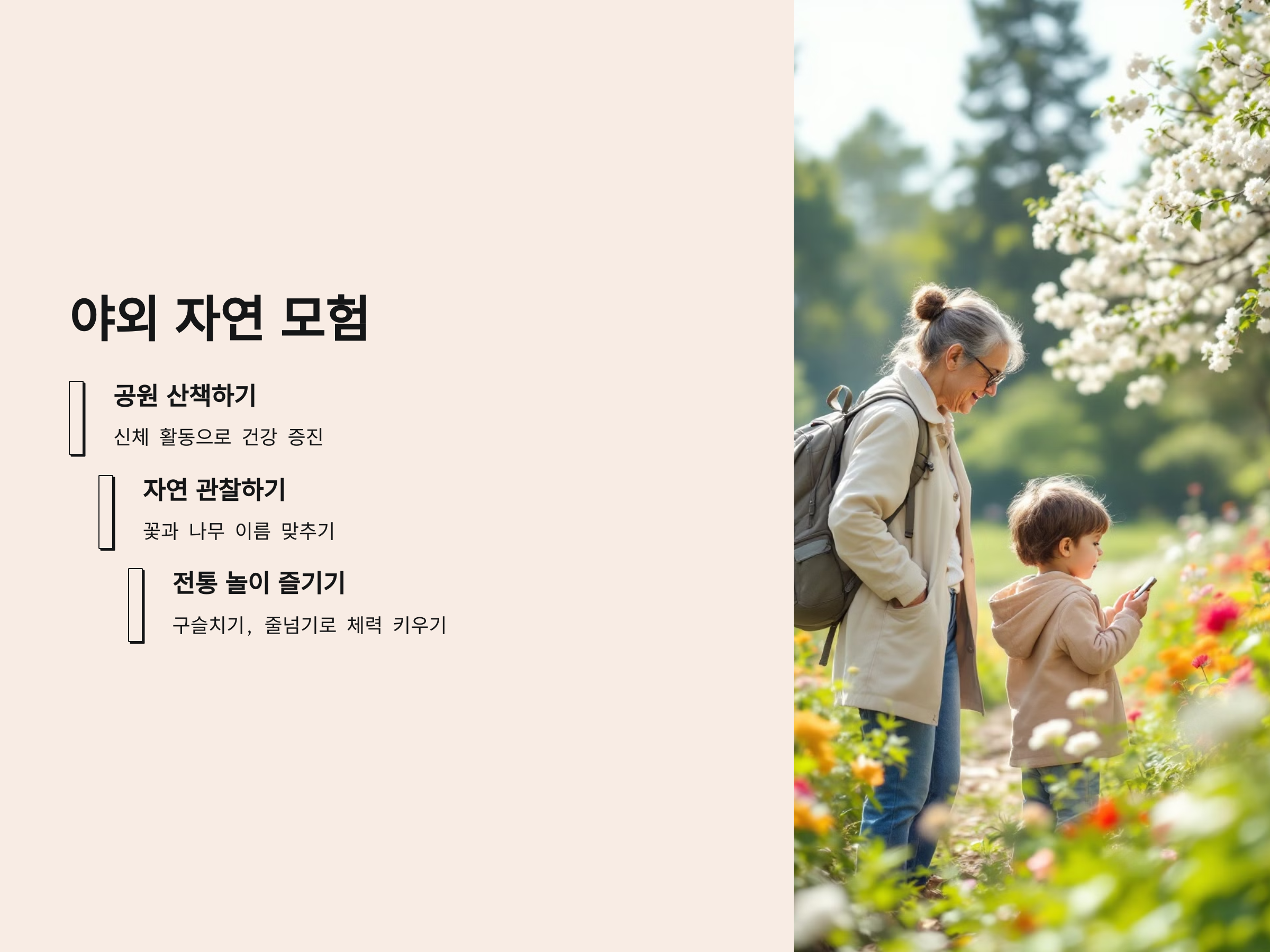 손주가 자연 속에서 모험을 즐길 수 있도록 돕는 것은 아이에게 중요한 발달 경험이 됩니다. 산책이나 자연 관찰, 그리고 공원에서의 놀이를 통해 몸과 마음이 건강하게 성장할 수 있습니다.
