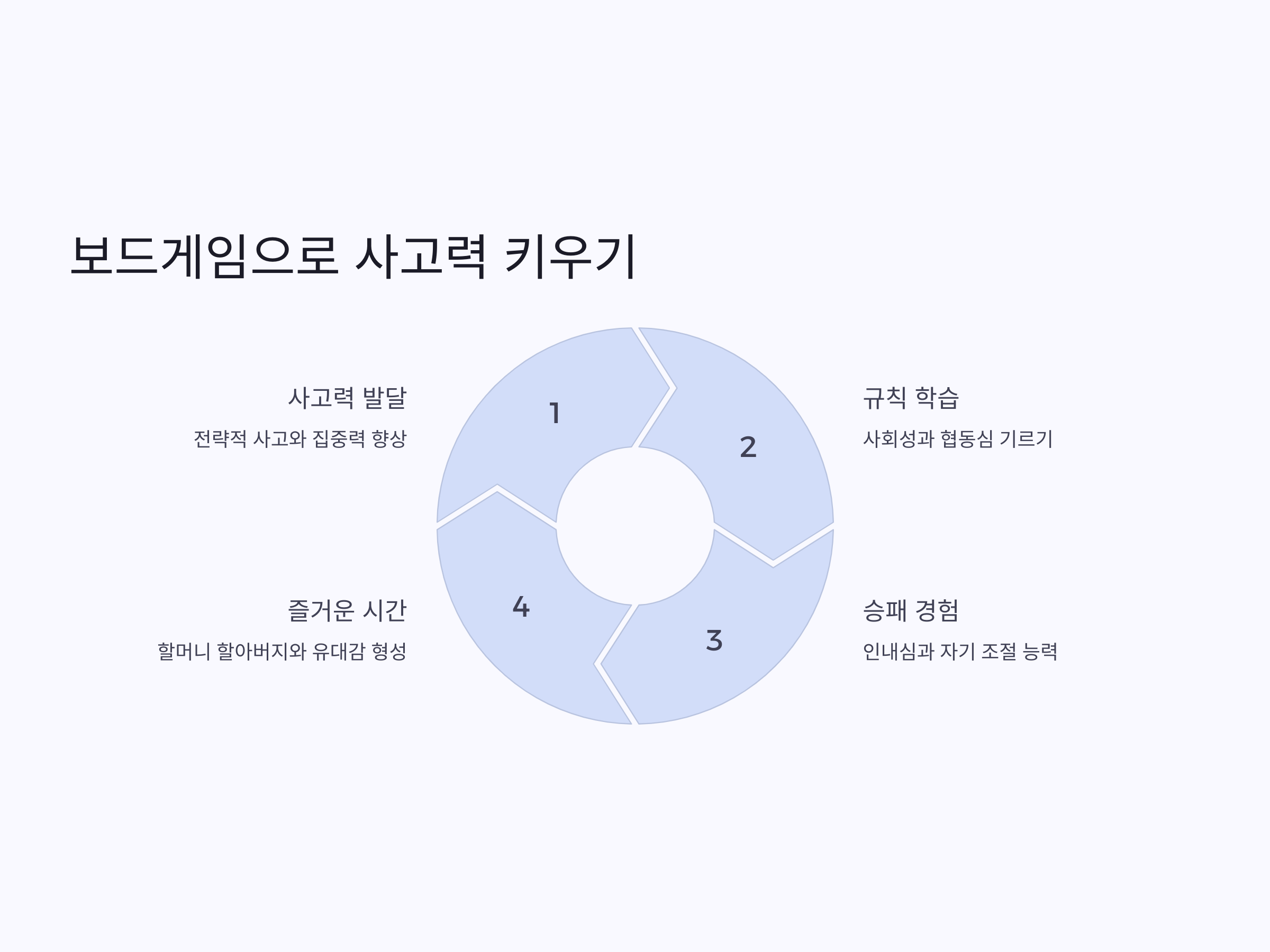 보드게임은 또한 규칙을 배우고 지키는 과정을 통해 사회성과 협동심을 기를 수 있게 합니다. 손주가 게임을 통해 승패를 경험하면서 인내심과 자기 조절 능력을 배울 수 있기 때문에, 성격 형성에도 긍정적인 영향을 미칠 수 있습니다.